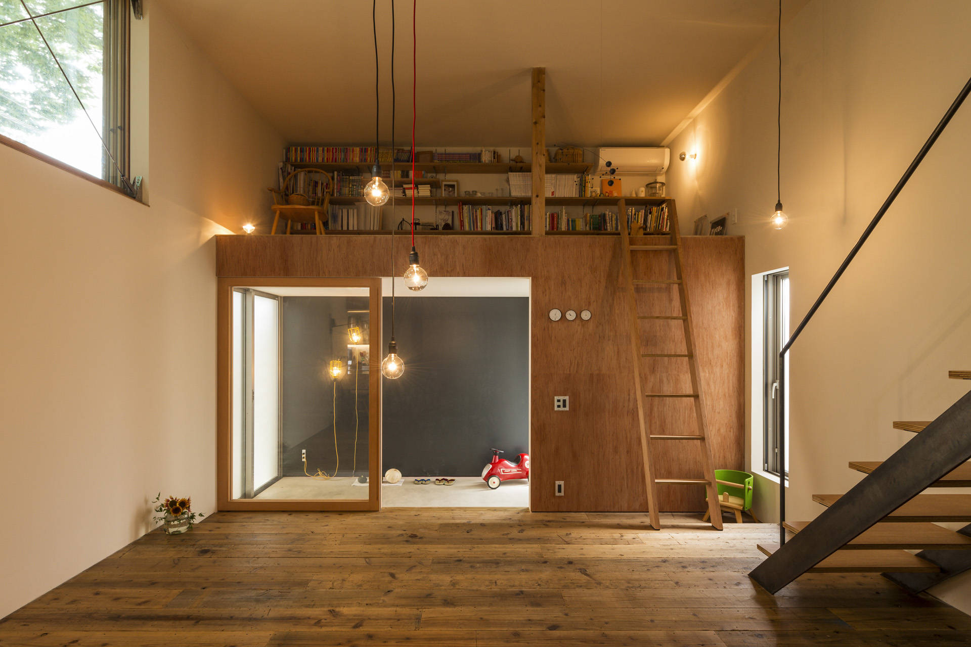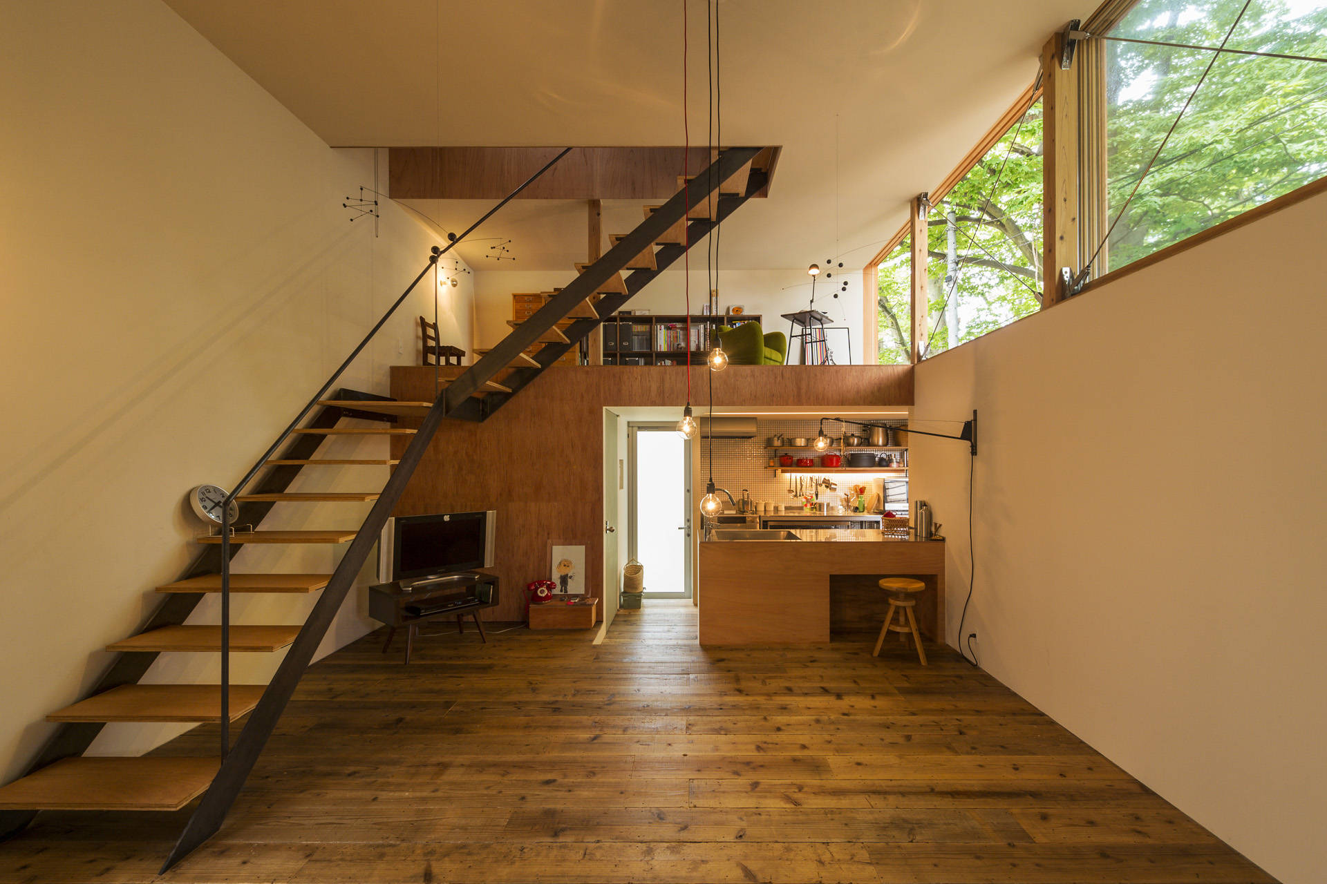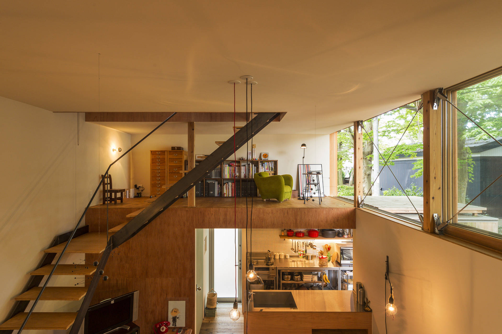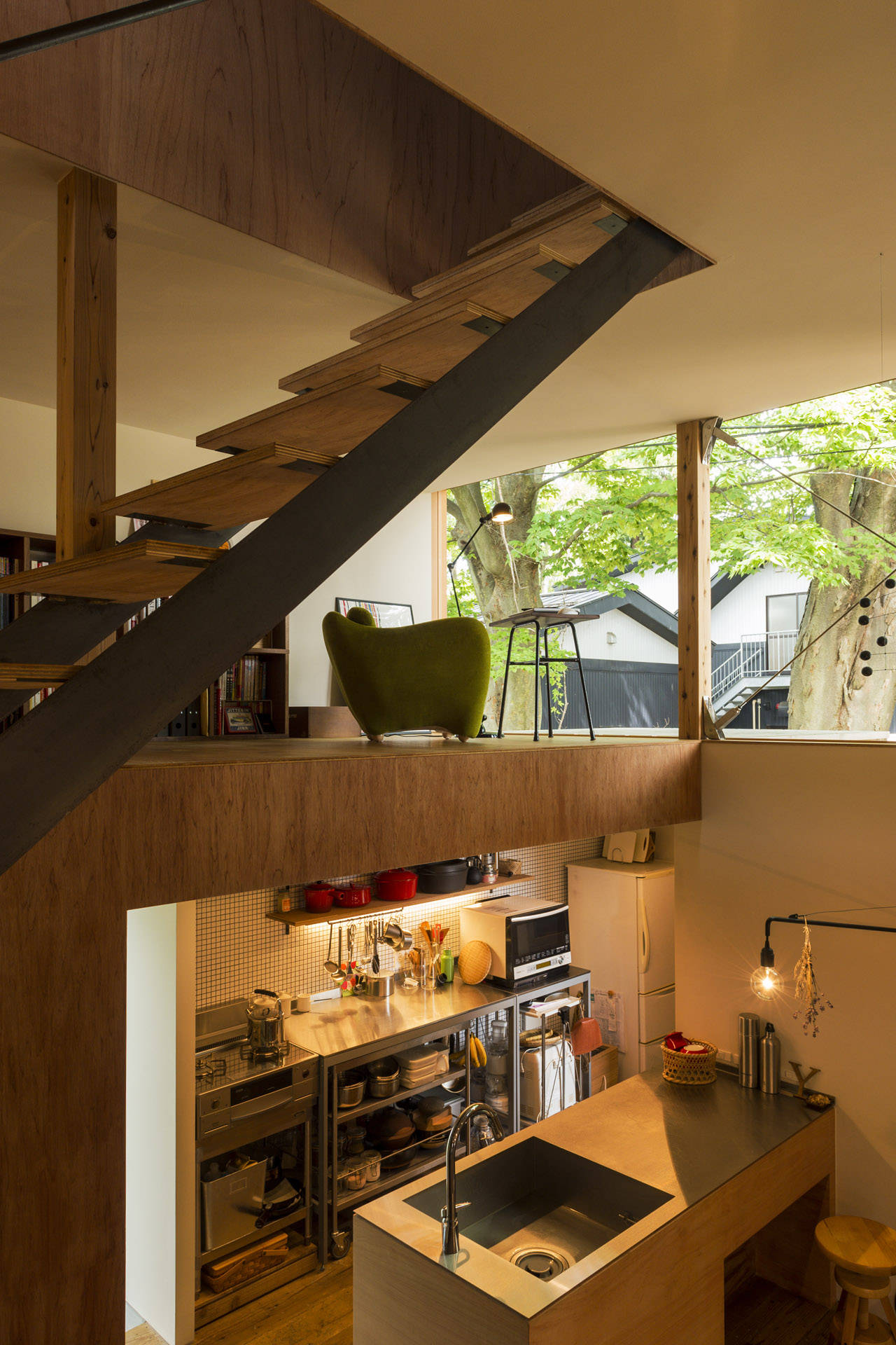 リビングの両端には階段の踊り場ともなるロフト空間を配置し、その先には大ケヤキに直接触れられるテラスを配置している。