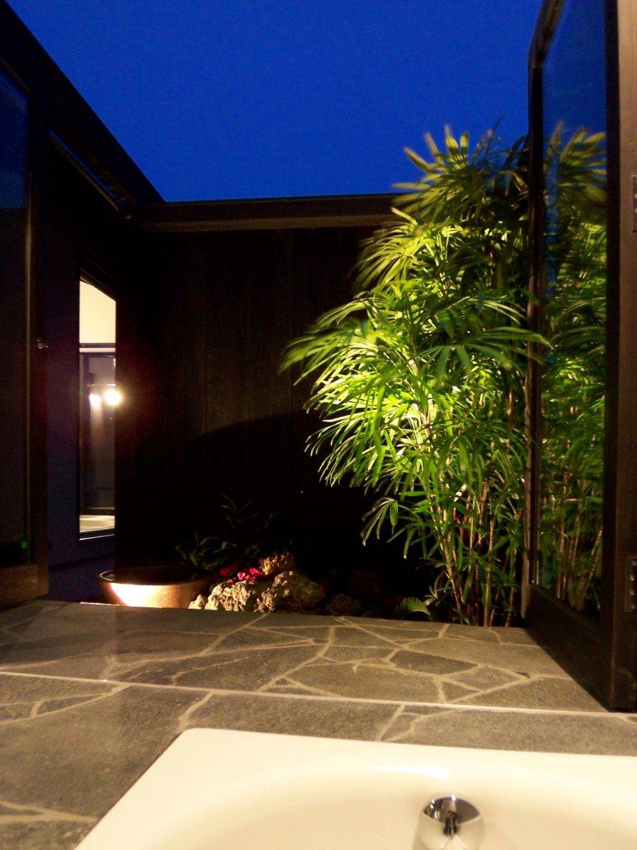 吹抜けや中2階のあるリビングを中心に、庭を見わたすデッキと和室、バスコートのあるお風呂など、毎日をリゾート感覚で暮らすことのできる家です。
