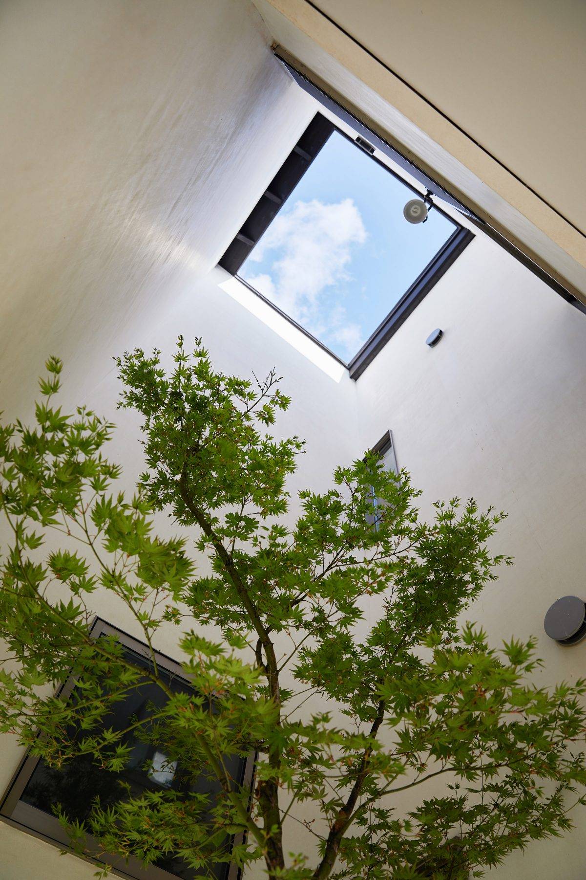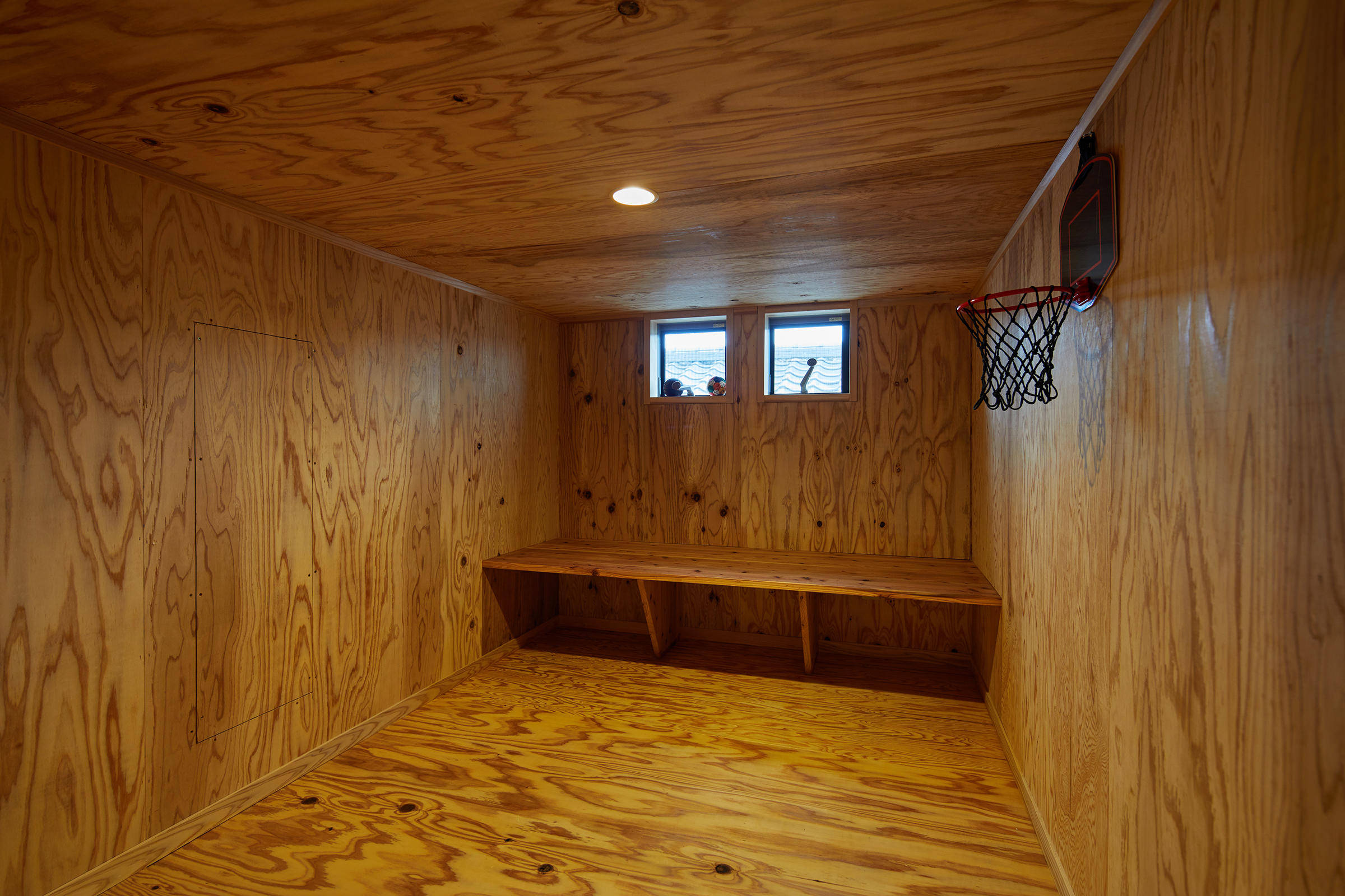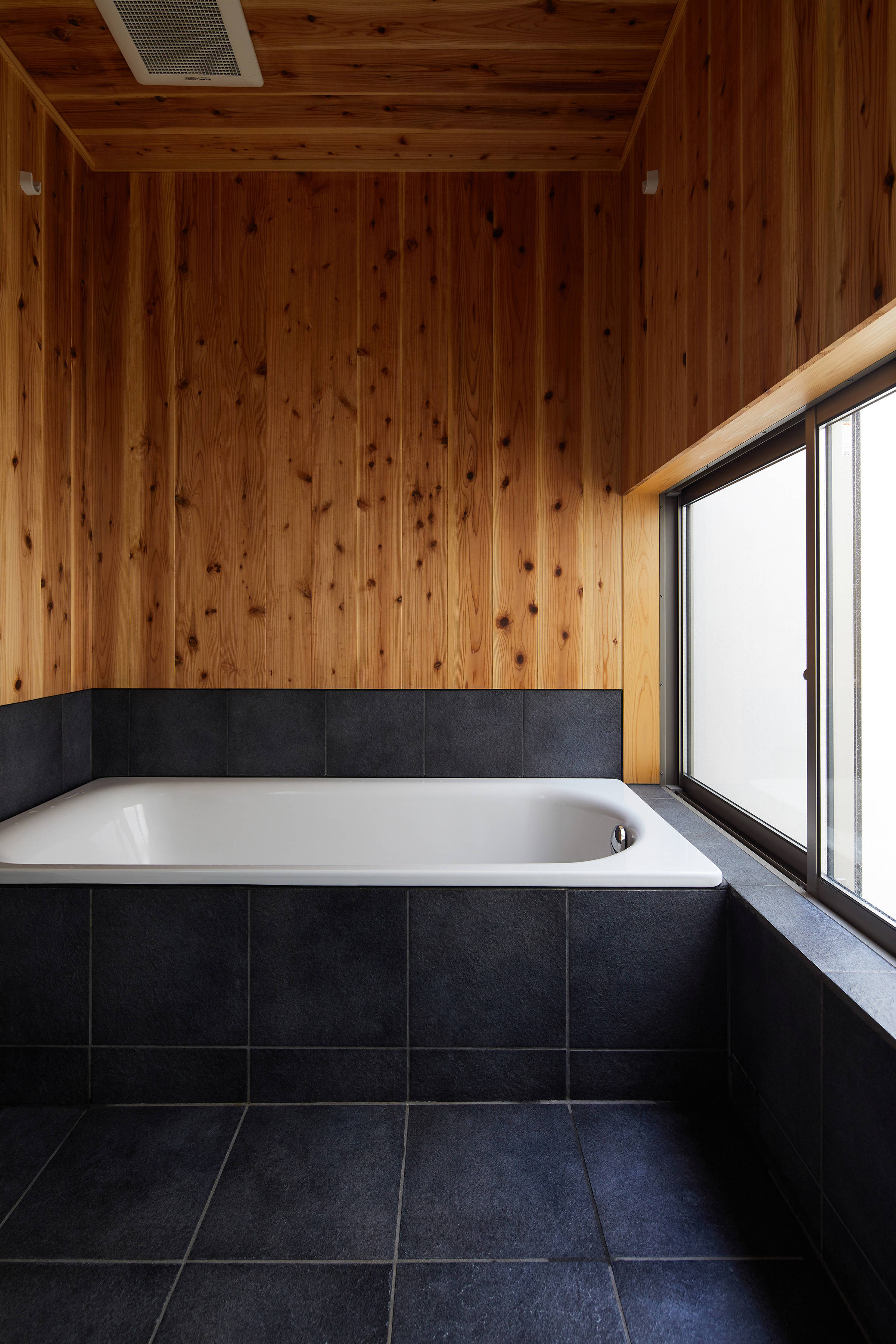 1階部分が杉板張り、2階部分は漆喰塗りの外壁と、南側に深めの軒を出した緩い片流れの大屋根という、シンプルな外観です。