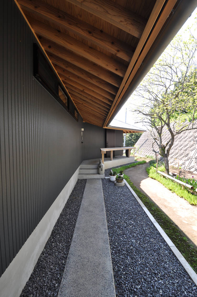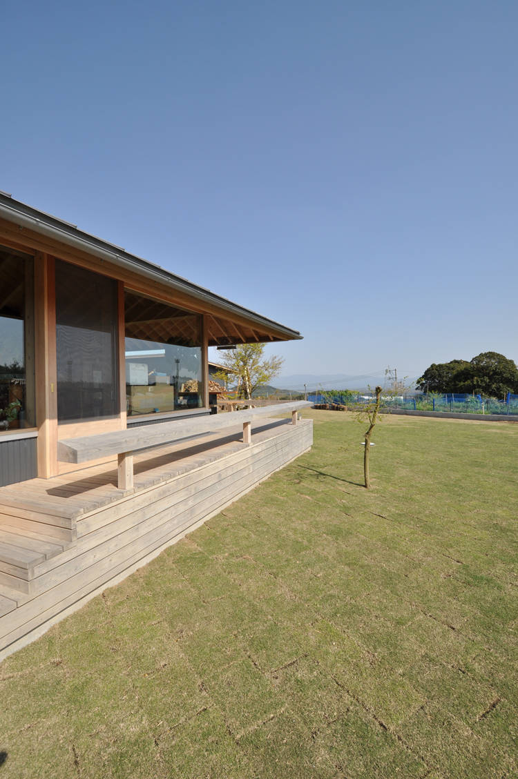 庇をぐっと出したプロポーションは、鹿児島の夏の暑い日差しを避け、台風の風を除け、桜島からの灰の影響を低減します。深い庇と高い位置に設けた通風窓により梅雨の間でも窓が開けられるようにしています。