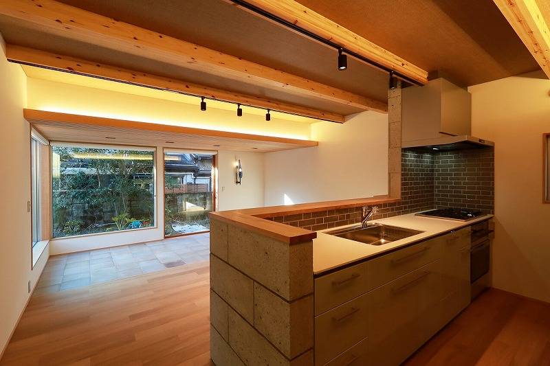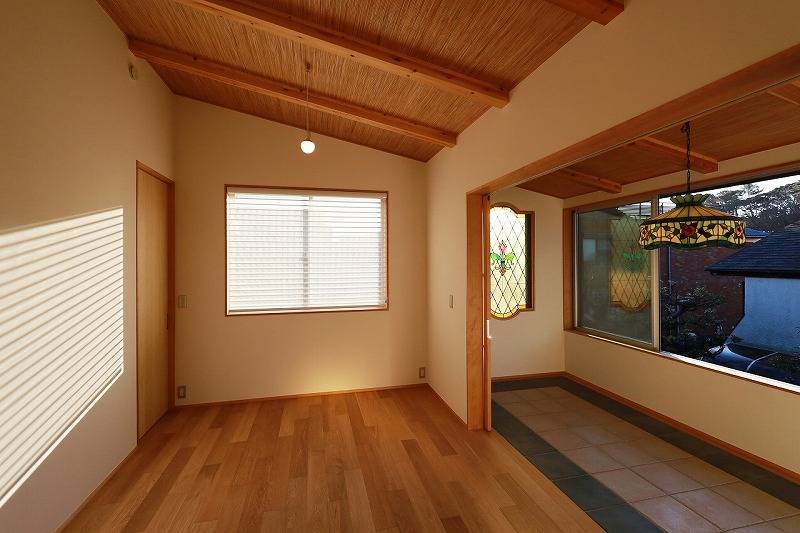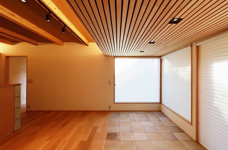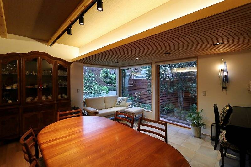 1階LDKの庭側は床暖房を備えたタイル張り、天井は高さを押えた格子仕上げで、庭とのつながりを意識したガーデンコーナーとした。2階個室Cは南側を室内化したベランダとし、ガラス戸を開閉して季節の変化に対応する。ガーデンコーナーとベランダはともに外のような室内スペースを取り入れることで季節を通して多様な生活を生み出すことを試みている。