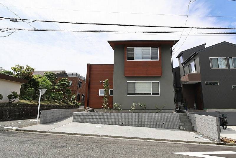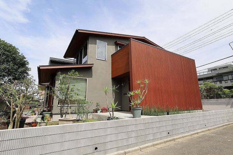 外壁の仕上げはモルタルグレーと木の2種類で、縦板張りは押縁で押え陰影を深くしている。