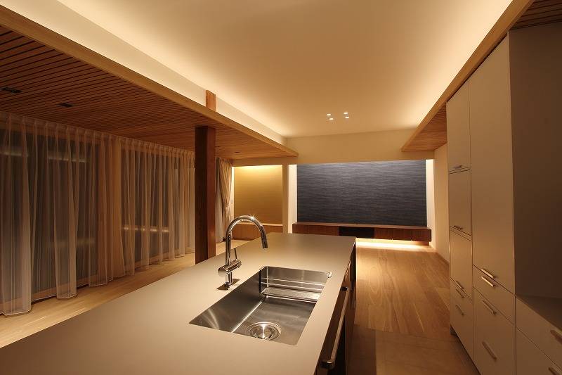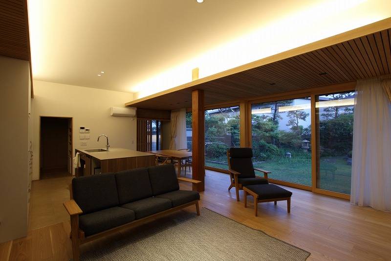 和室仕様だった客間8帖2間と広縁をワンルームとし、LDKとしてインテリアを全面的に改装する。庭側の窓はフルハイトの大型木製サッシとし、大きく庭に広がる開放的な空間となる。天井は庭側(1間)を格子張りで低く抑え水平感を出す。逆に内側(2間)は天井を高くし間接照明で明るく照らし垂直感を出す。