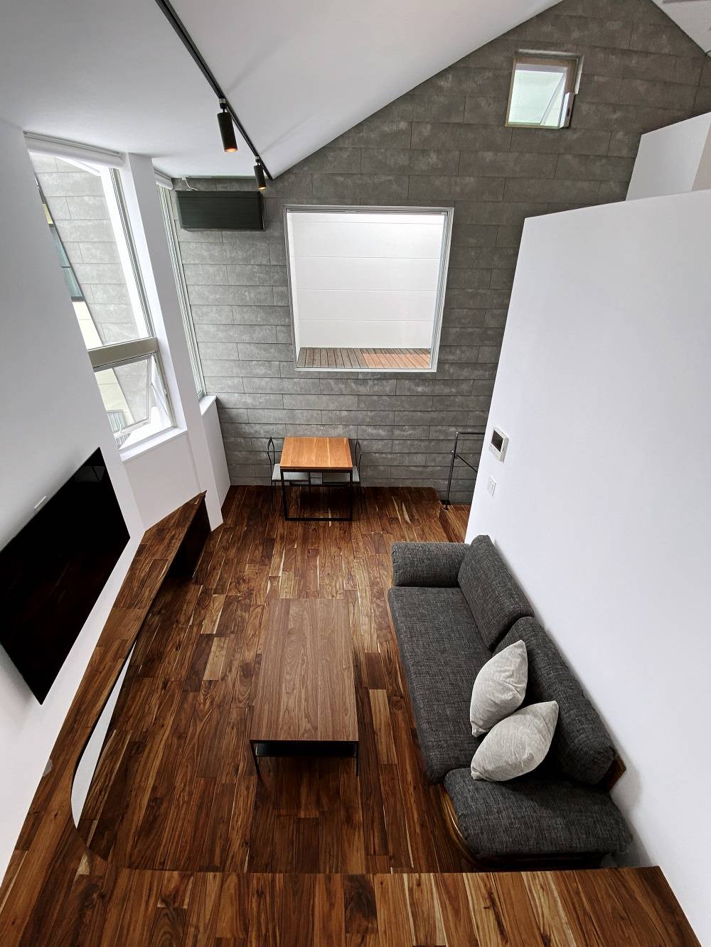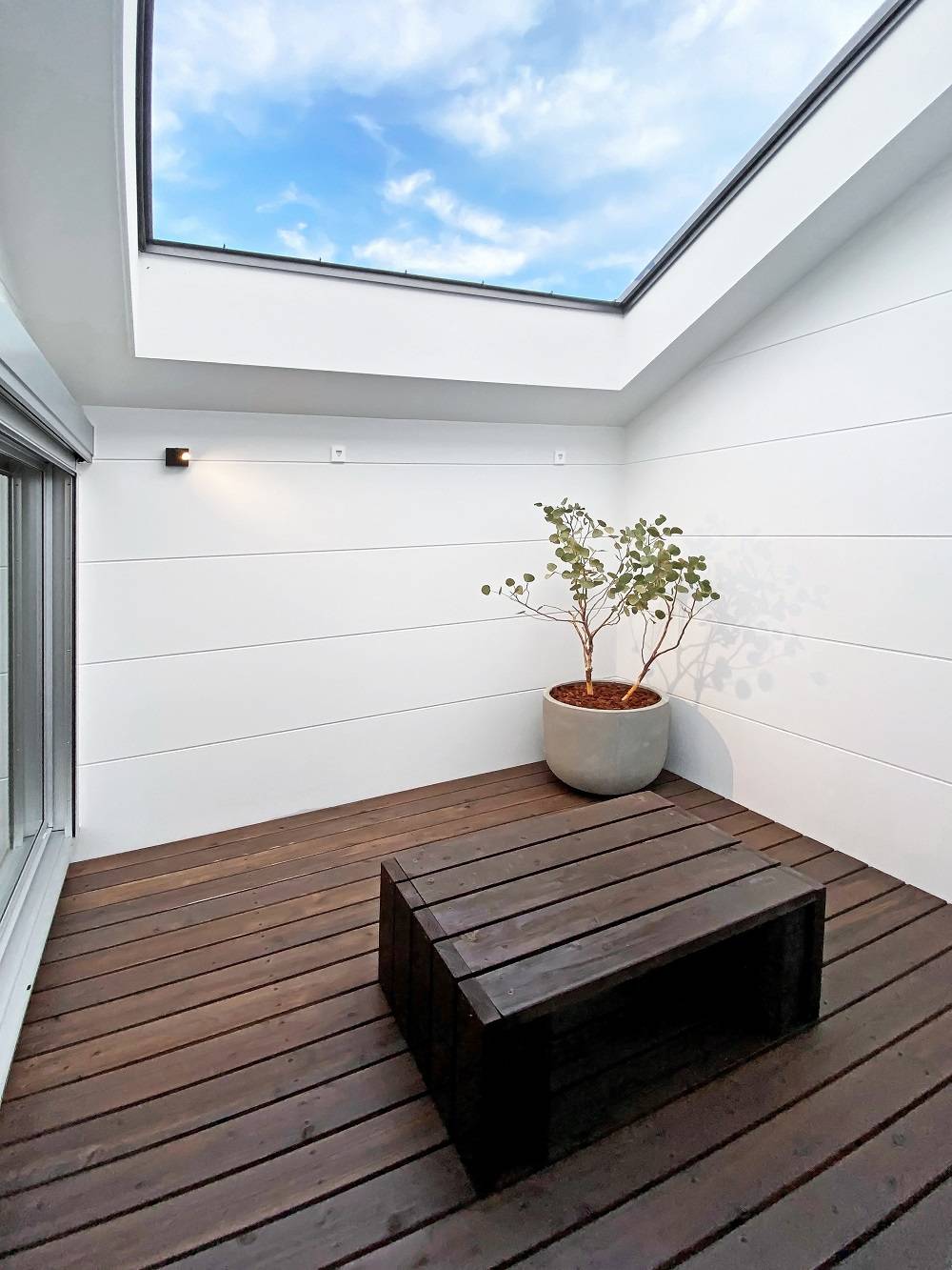 ルーフテラスは、隣家からの視線を気にせず利用できる屋外部屋として利用しています。ベンチは、余り材を利用したDIY作です。