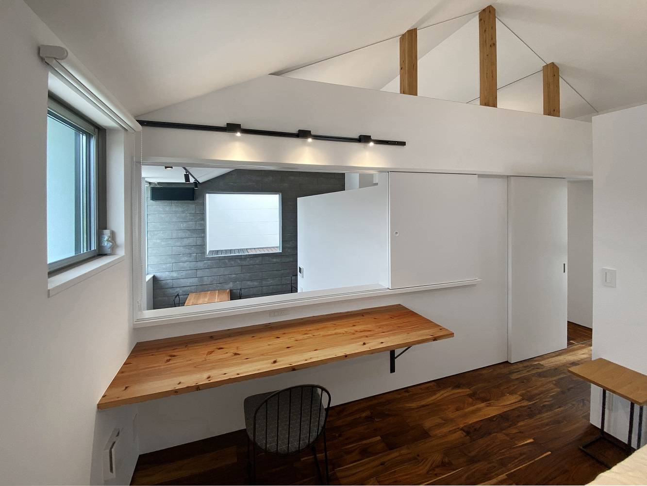リビングダイニングを望む。天井は屋根勾配に合わせた船底天井です。設計段階より家具等のサイズに合わせた無駄のないスペースです。