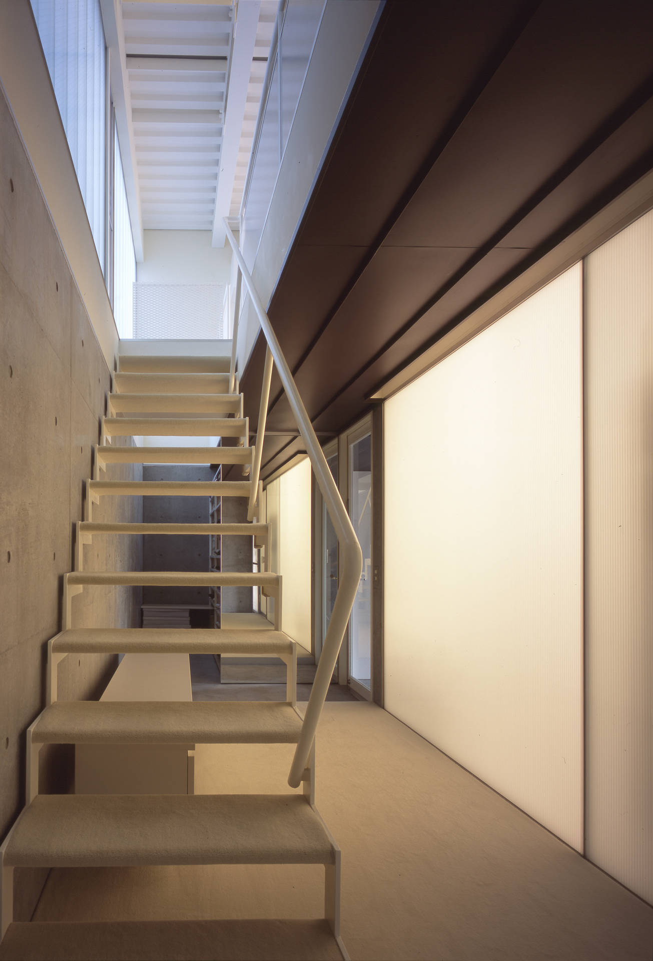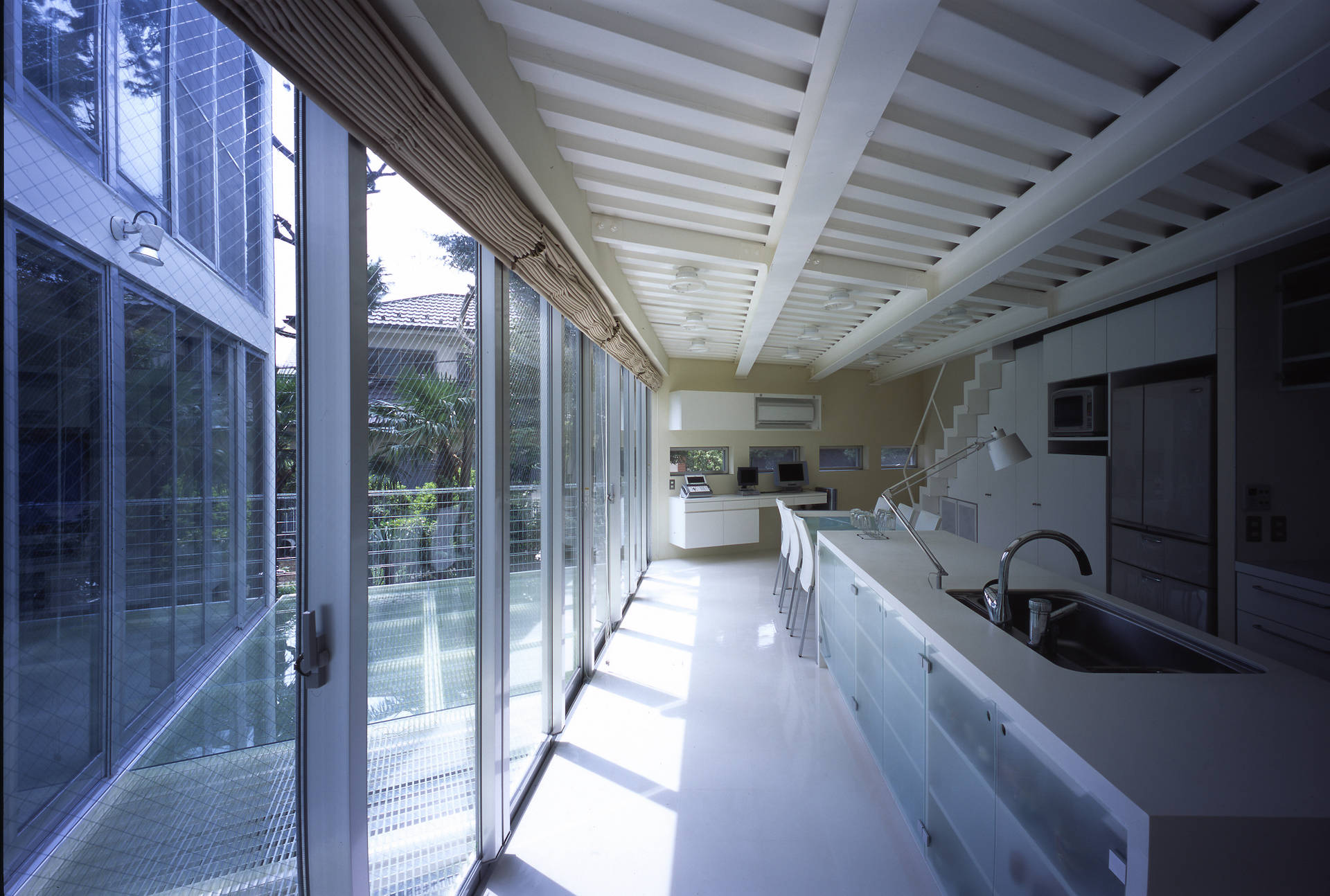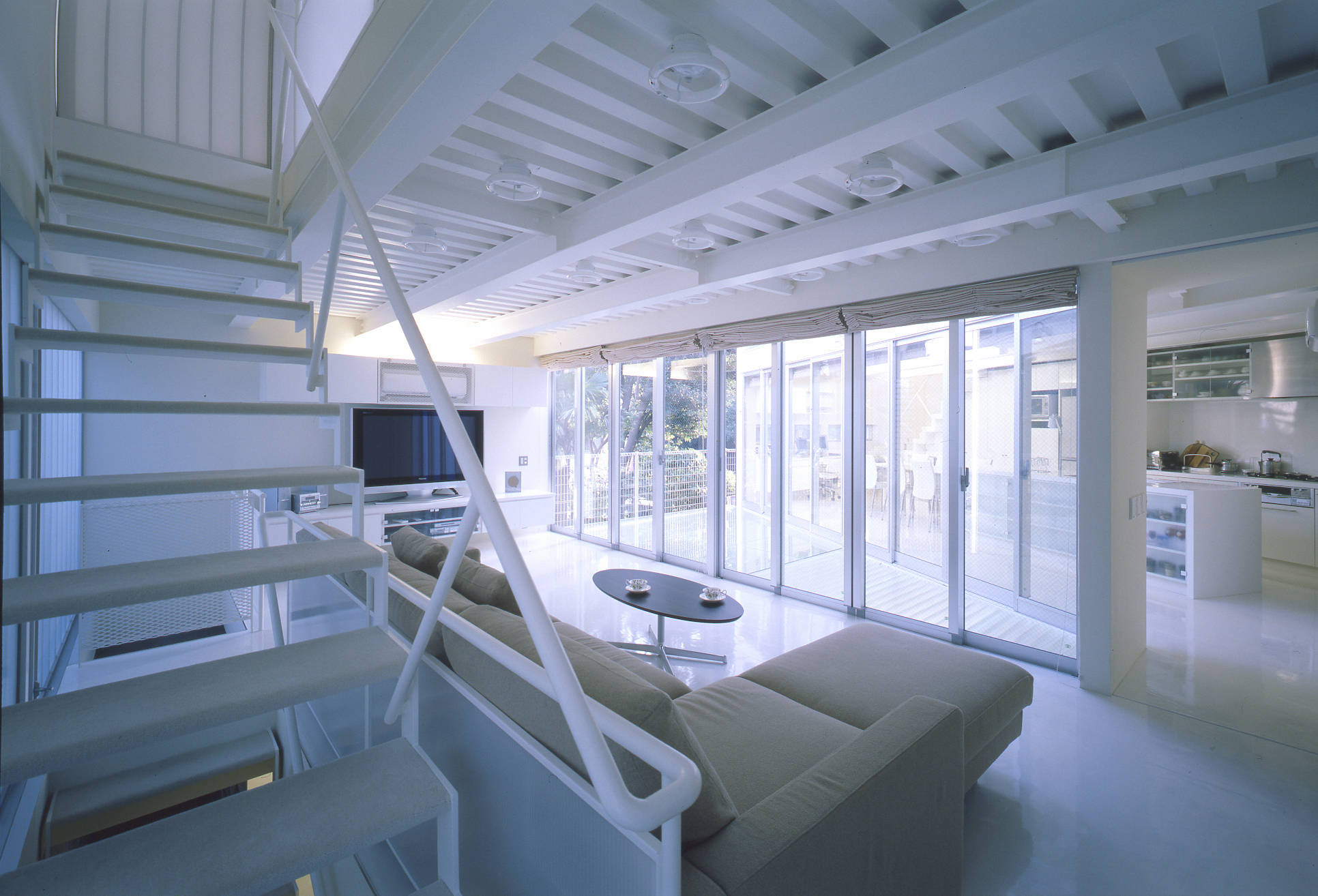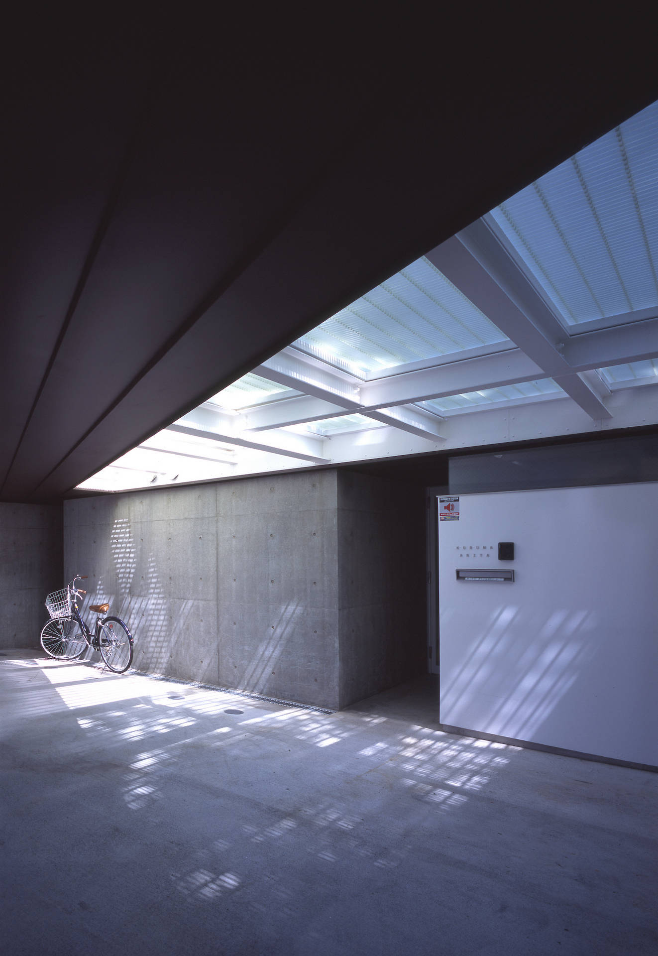 鉄骨の箱の下は、駐車スペースと玄関アプローチ、載せた箱が住居部分となります。鉄骨の箱(住居スペース)は、道路側からの騒音と西日を防ぐため開かず、箱の南側をV字型に開きました。