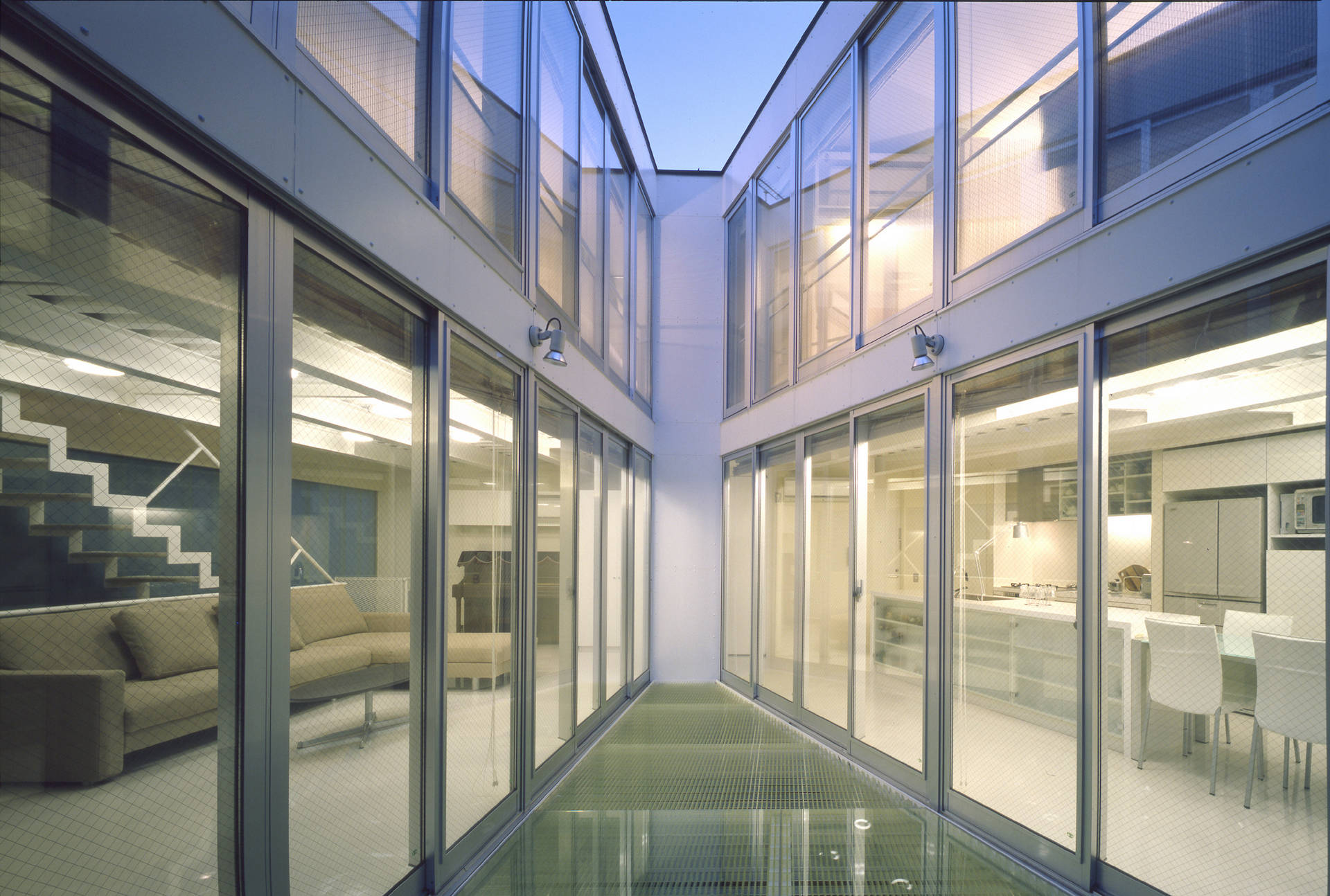 また、中庭デッキテラスにはFRPグレーチングを敷き、そこを通り抜ける柔らかい光が玄関アプローチを演出するように計画しました。