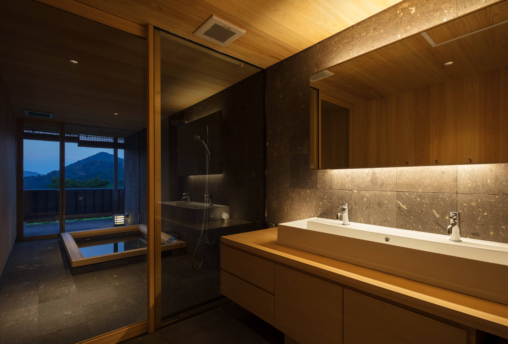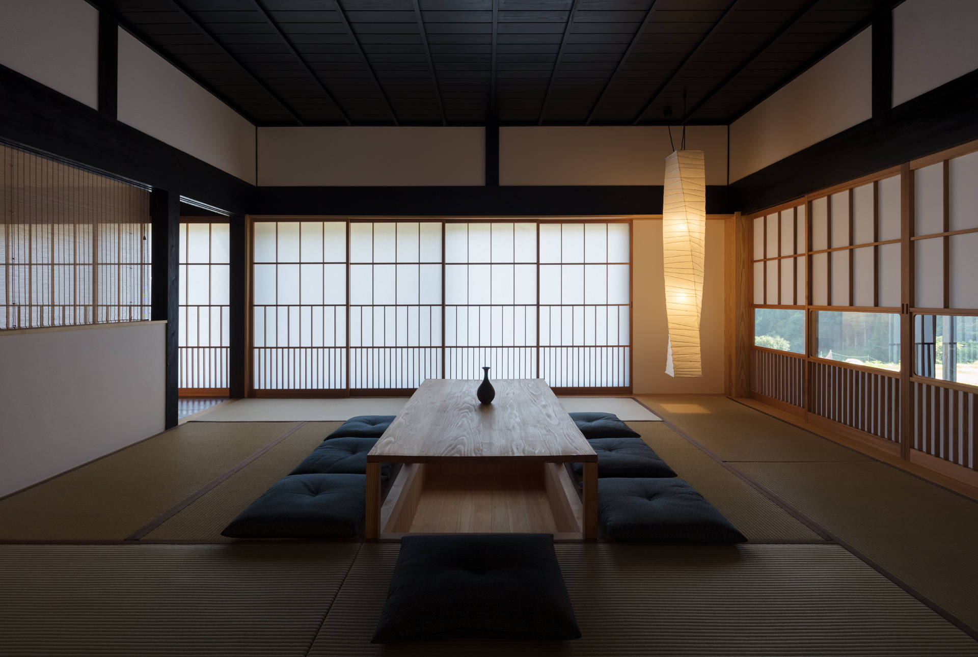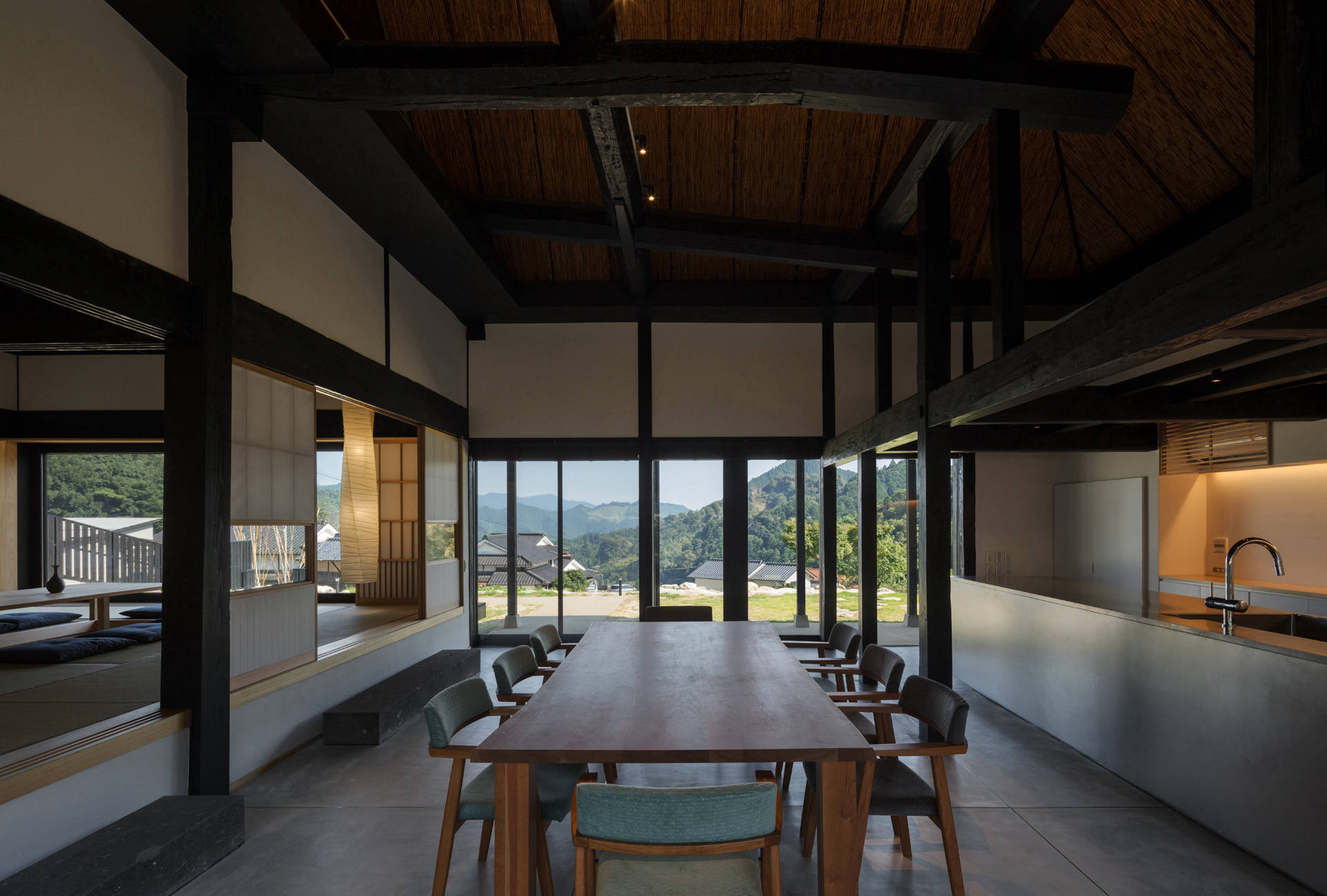 棚田と古民家の魅力を最大限引き出すために、増築や改装が繰り返されていた既存の古民家をなるべく原型にもどしながら九州産の素材にこだわり、新しく提案した全体の1/3ほどの大きな土間空間と吹き抜け、そこに設置したオープンキッチンカウンターを中心に、宿泊者がゆったりと日常から離れリラックスできる空間を目指しました。