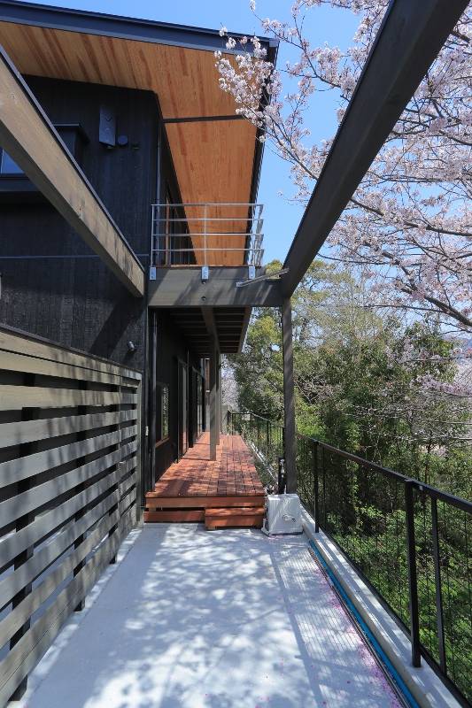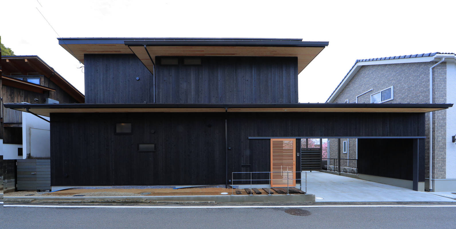 南面が河川に開けた敷地。河川敷の春の桜に新緑、夏の木陰に秋の紅葉を借景とし楽しめる住まいを計画した。北側の道路面は開放的な河川側とは相反し、開口を少なく焼き杉とナチュラルな杉色のコントラストを強調したファサードとしている。