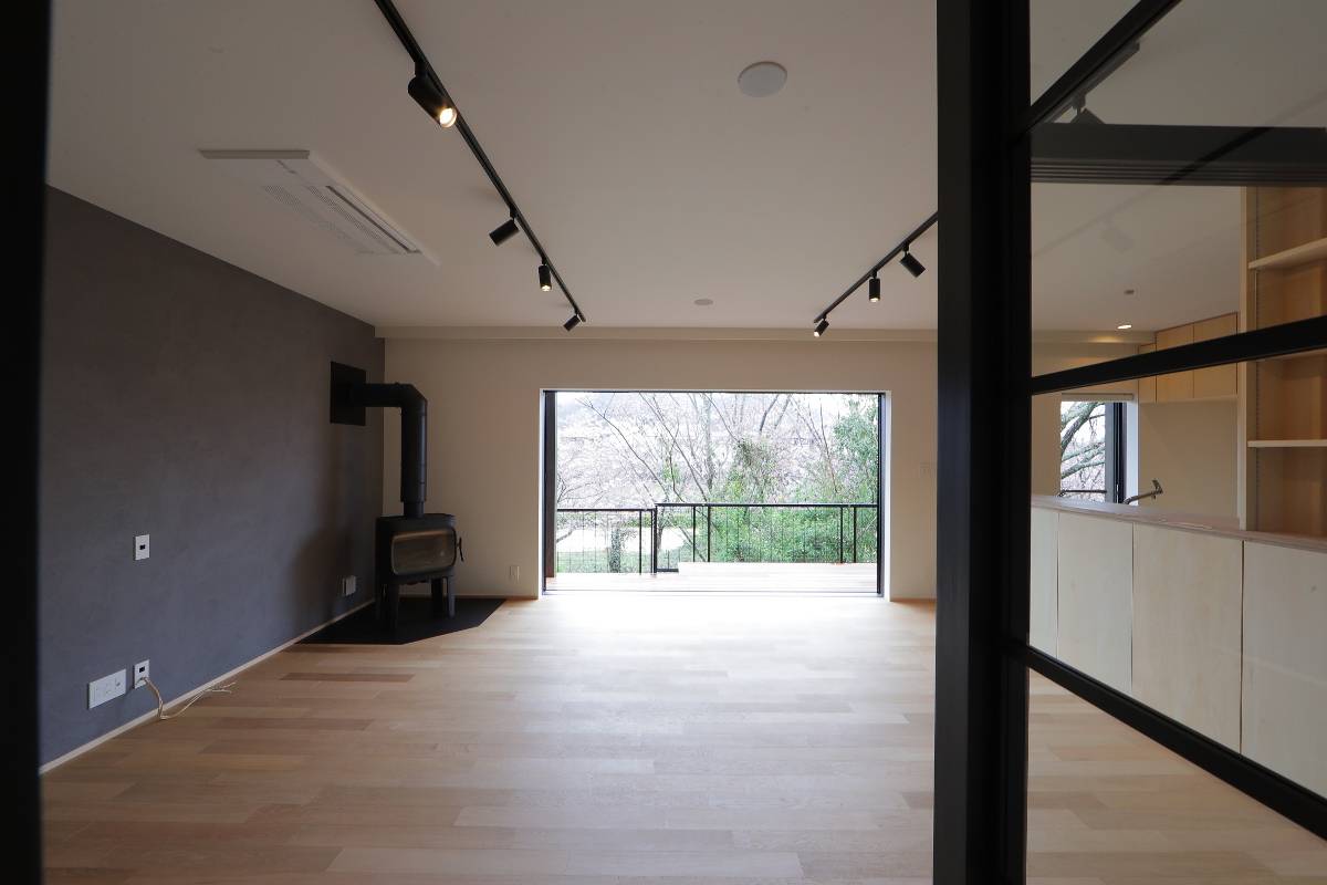 河川敷きに面したデッキと繋がるリビング