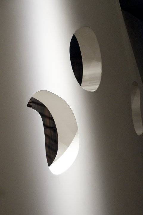 角地に向け曲線のファサードをもつ住宅。 曲面の壁は周辺に柔...