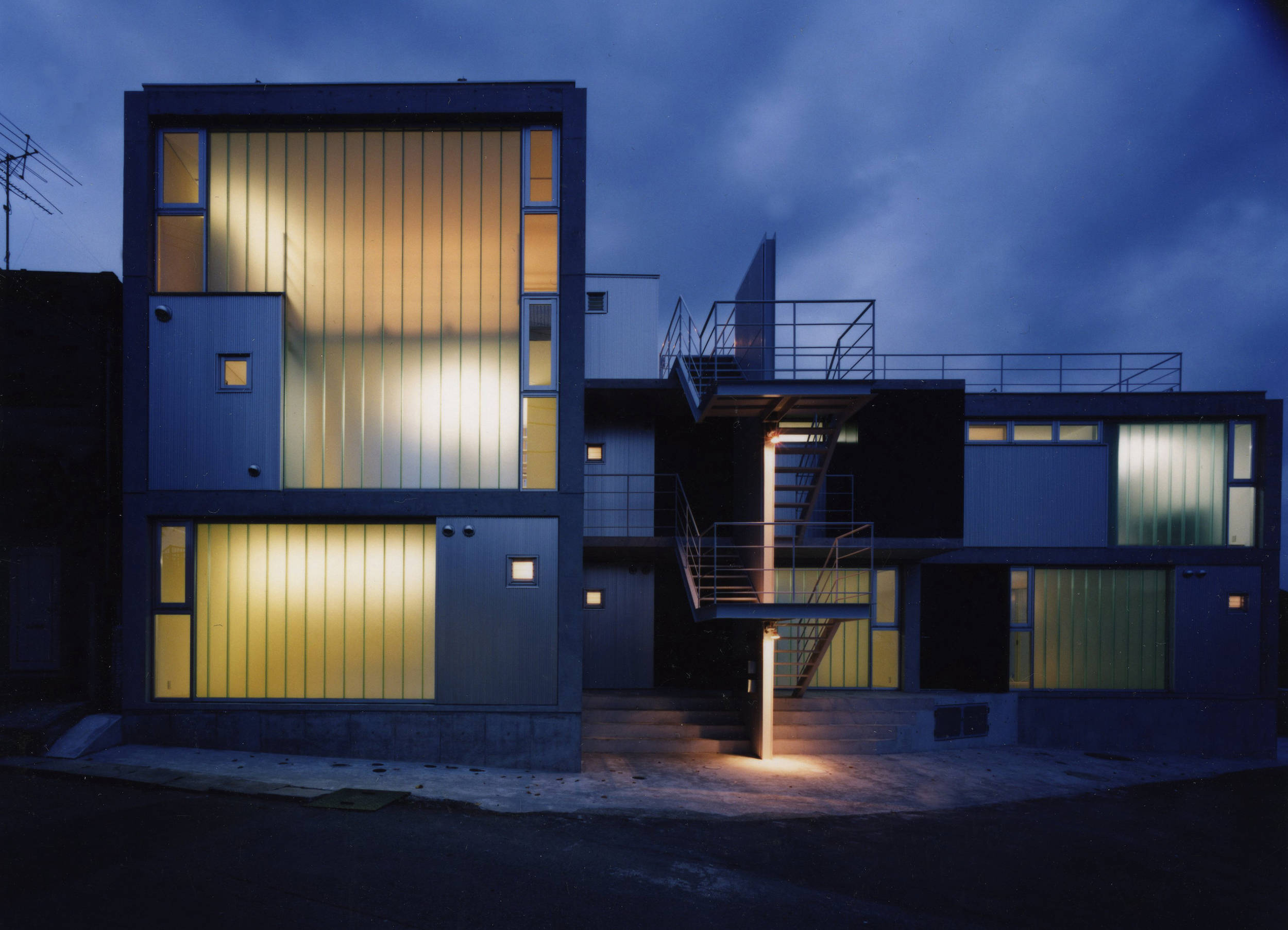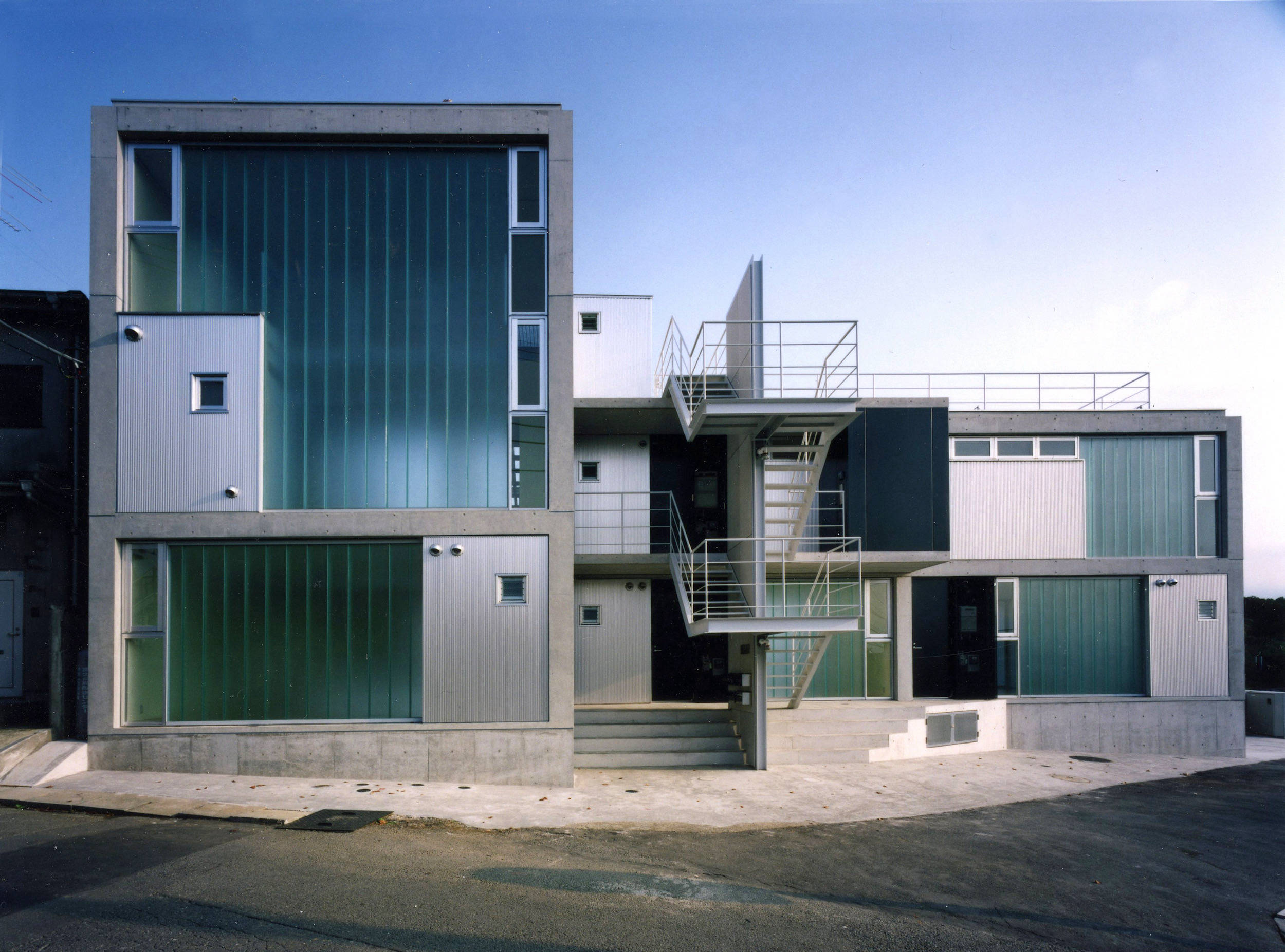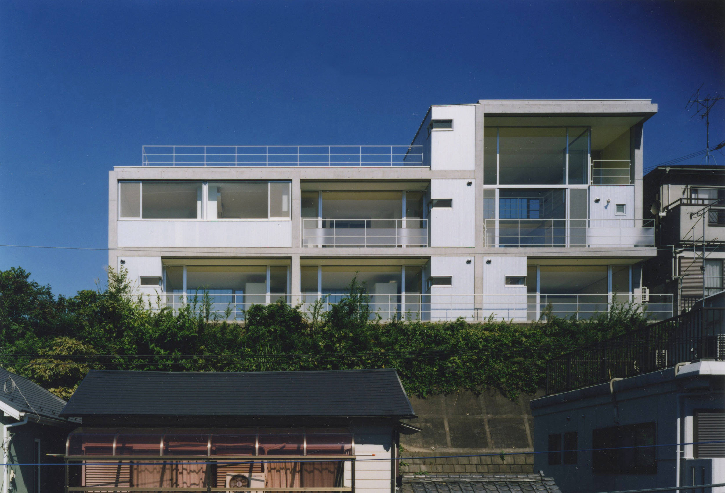 眺望のいい丘の上に建つ5世帯の小さな集合住宅です。北側接道の東西に長い敷地に対して、南側に間口いっぱいに開口を取り光をふんだんに享受するため、鉄筋コンクリート3階建の偏平ラーメン構造としています。