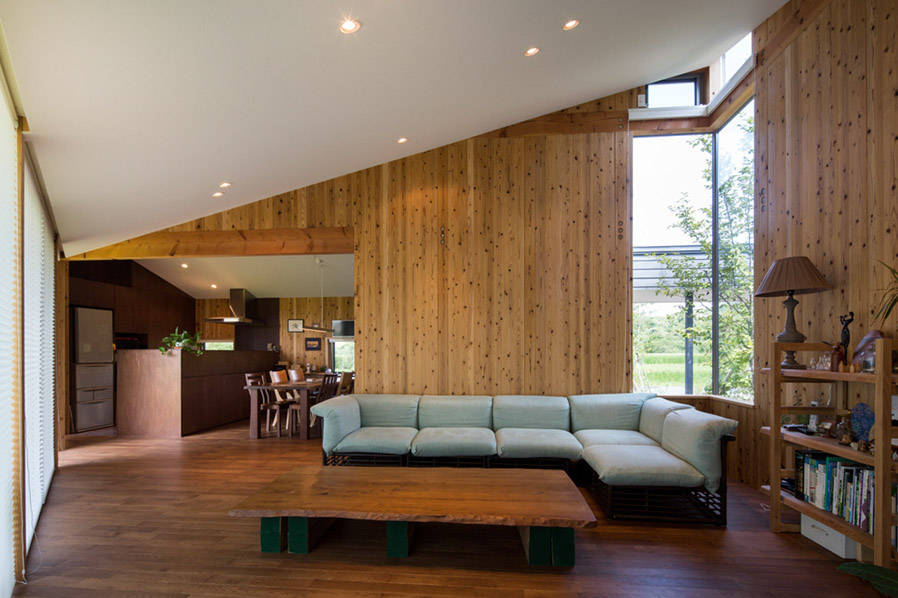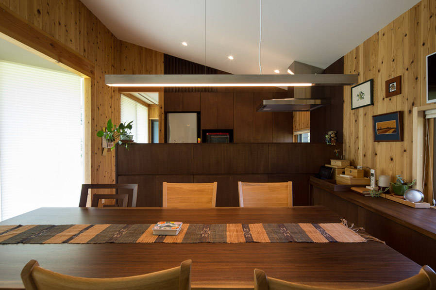 建築は地球温暖化阻止と脱プラスチックを建築でも貢献しようと、私どもが開発した、柱と同寸の角材をボルトで束ねて連結壁パネルとするFSU工法で建てたものです。木材を大量に使用して森林整備に貢献しつつ、不要となっても解体部材は再使用が可能で、破棄物を極力出さない工法です。