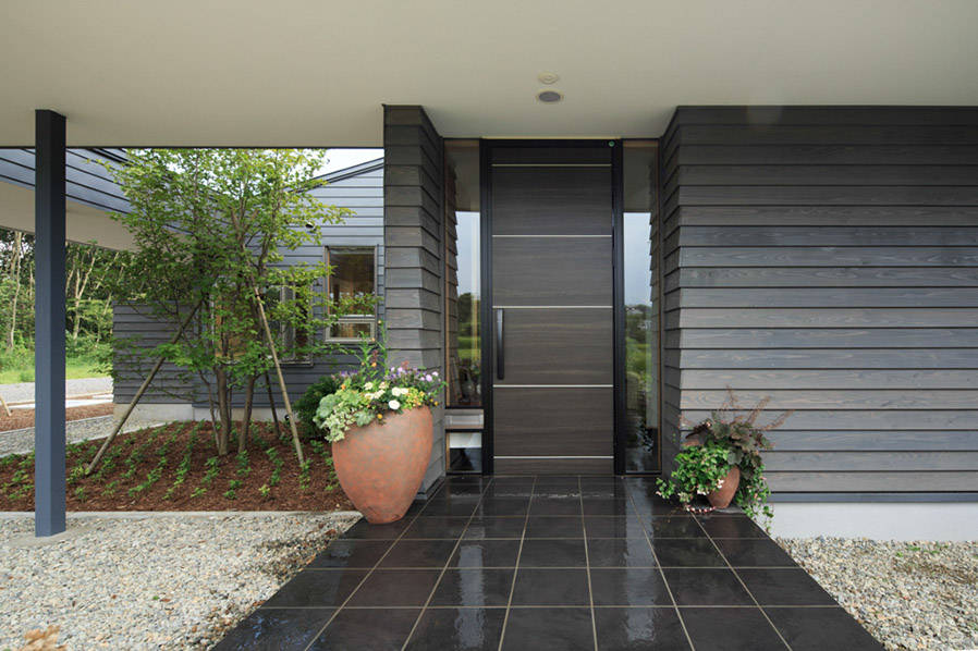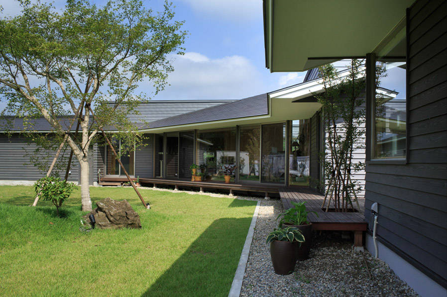 そこで道路や方位と季節風を考え、庭を大きく取り囲むように所要室をL型に並べた配置計画とし、敷地全体に統一感をもたせました。