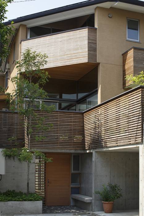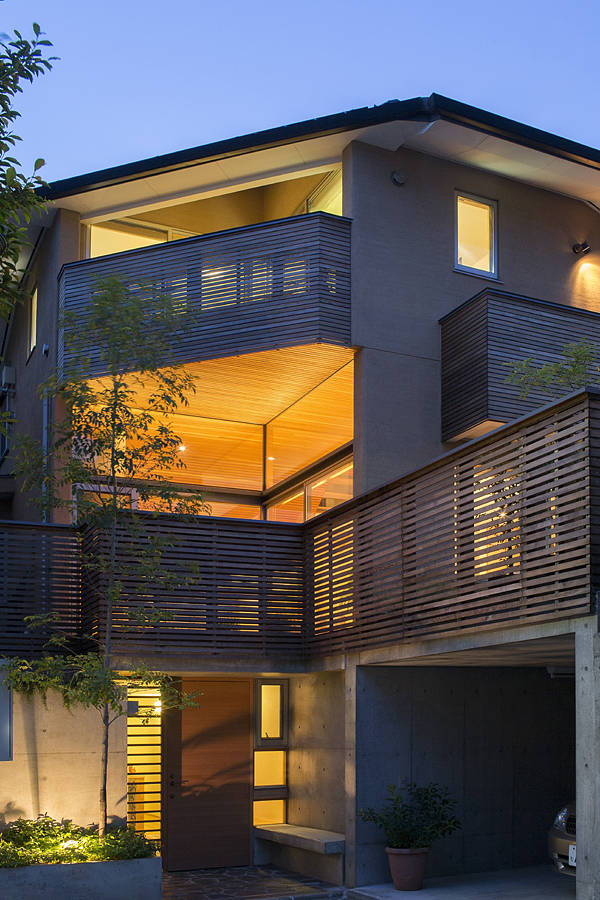 玄関の上は二層目にありながら、一階となっていて居間と食堂用のベランダにし、その上に子供室用のベランダを設けています。