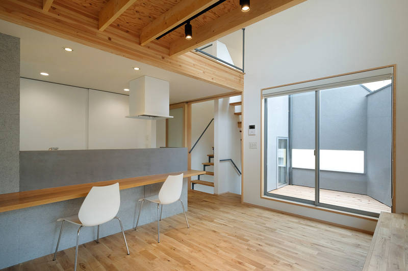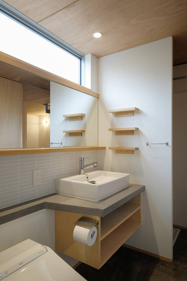 若いご夫婦はあまり広い居住スペースは必要としないが、周囲の視線を気にしないで窓が開放できるリビングとオープンなキッチンを持つ自分たちの生活スタイルにフィットする家を望まれた。設備機器なども含め、こだわりのある素材や場所ごとの雰囲気など各種の要望もあった。
