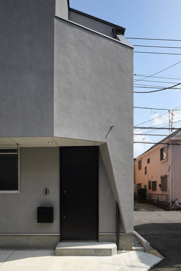 外観は敷地形状をそのまま表した多角形の平面に、2階テラスへの採光を確保する部分が切り取られたシンプルな形状で、南側1階車庫の上部が張り出している。