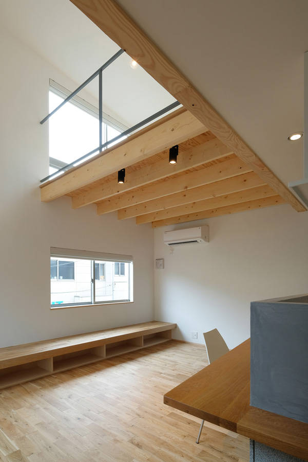 小さな家が建ち並ぶ近い住宅地で、14坪という非常に小さい敷地は地盤もあまり良くなく、3方を道路に囲まれ厳しい斜線制限があるという条件。