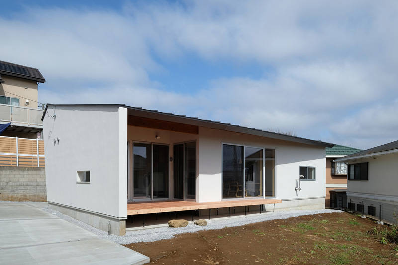 旗竿状のアプローチの奥にある比較的広い土地は擁壁の上部にあたるため、日当たりも良く、当初から計画は平屋を前提に進められた。