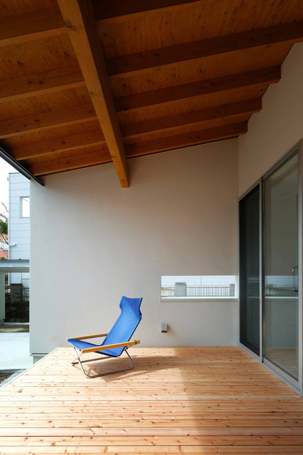 変形の切り妻で南側は軒を大きく張り出し、浴室と洗面は南面を全面ガラスとして広い外部テラスへと連続するシンプルで明るく開放的な平面計画とした。