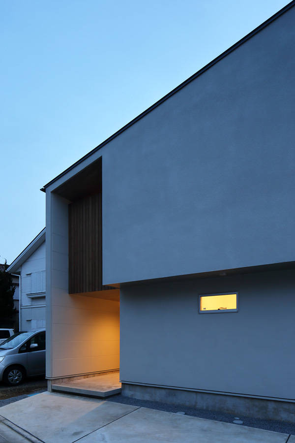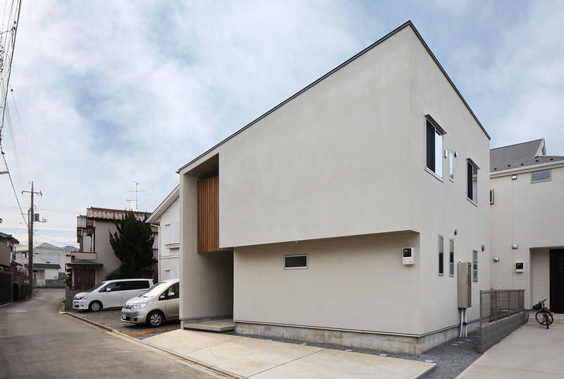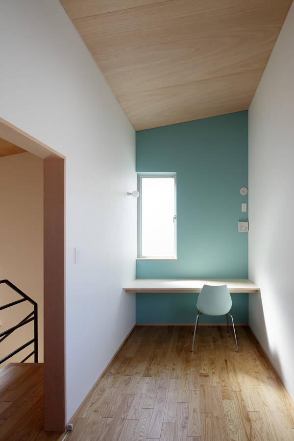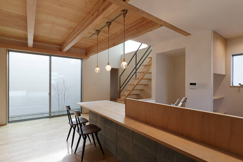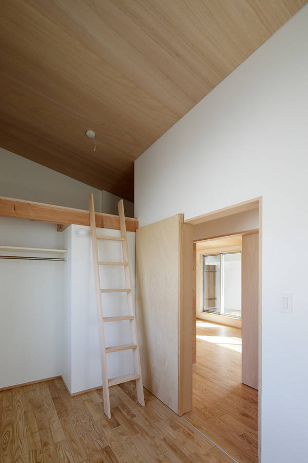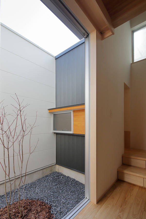 密実な住宅で囲まれる立地ながら1階にリビングを確保したいという要望より、東側に細長い中庭を配置しプライバシーを保ちながら大きな開口を確保するプランとした。中庭延長部分のピロティ状の玄関上部の2階テラスには片流れの屋根をかけ、気持ちのいい半屋外空間とした。屋根の高くなる西側子供室の上部には小さなロフトを設けている。