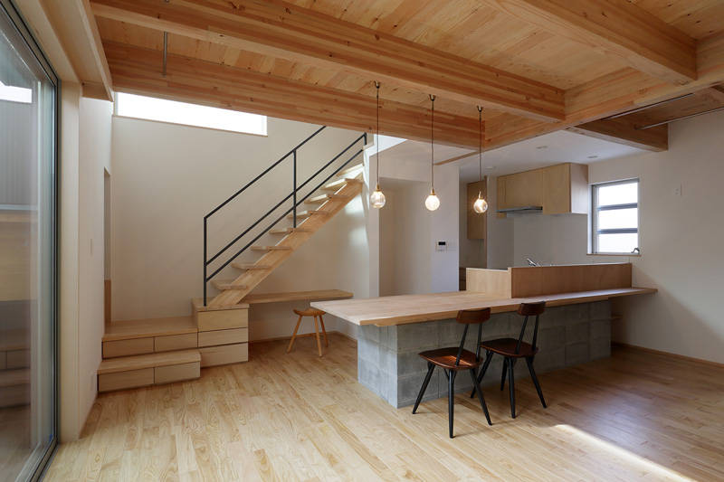 リビングから2階へ続く南側の階段は明るい吹き抜け空間で、オープンなダイニングスペースへと続く魅力的なスペース。その2段目の踊り場レベルには中庭を覗くことができる1畳の小さな茶室を設けている。