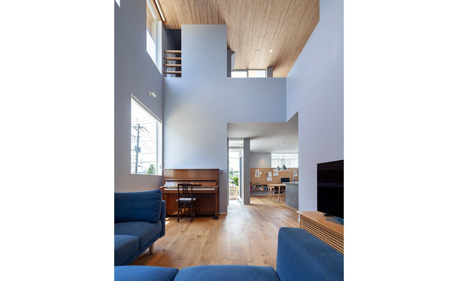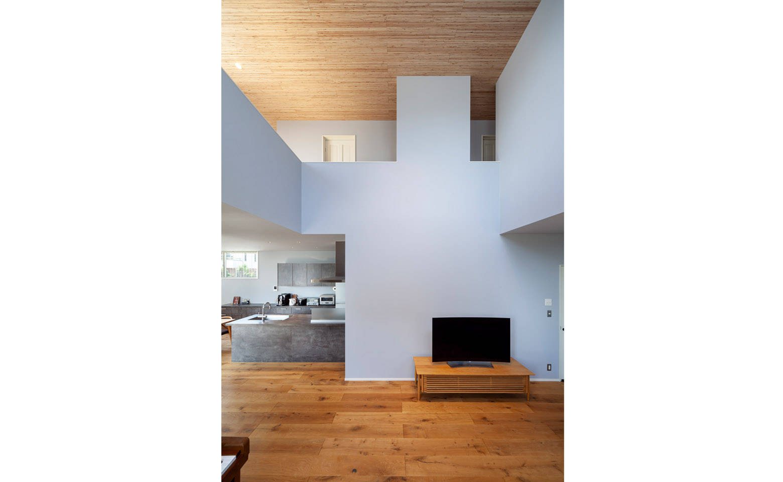 玄関を入ると玄関ホールはなく、まず最初に天井の高いLDKへと...