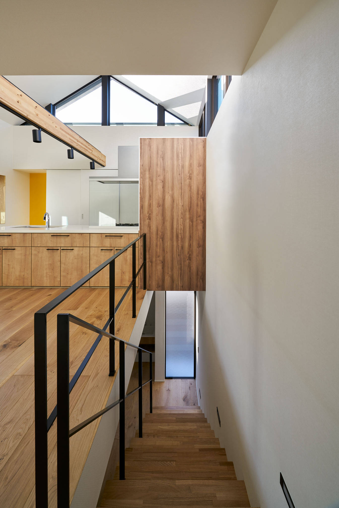 上下階の平面的なボリュームのずれで生まれた場所を中庭や2つの車スペースに使い、断面的に空間がある場所に半地下収納や二階上ロフトなどを配した計画です。