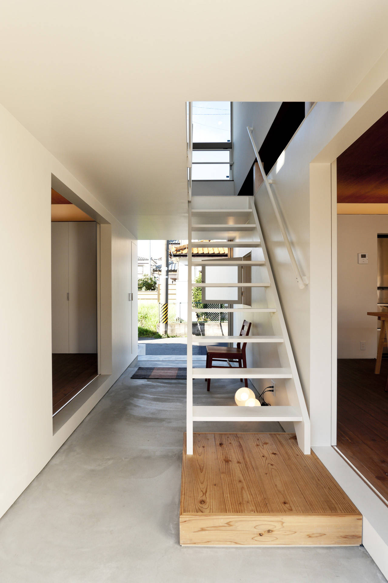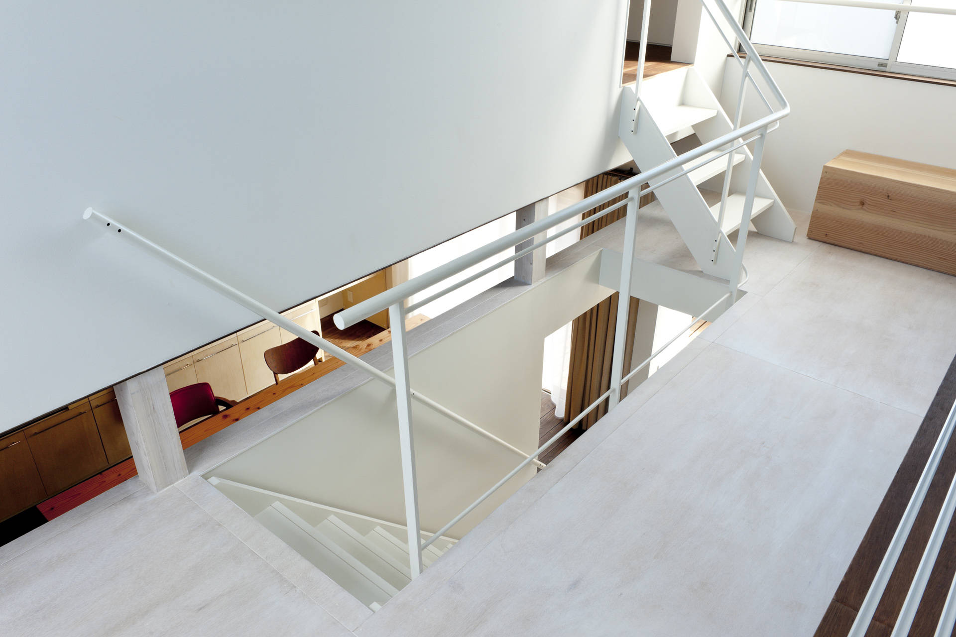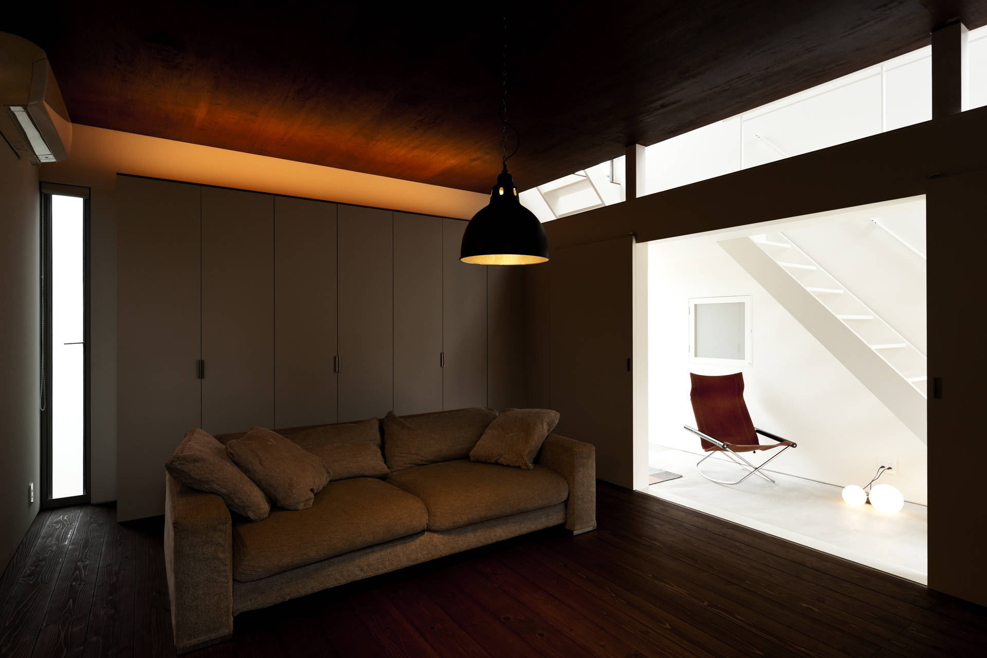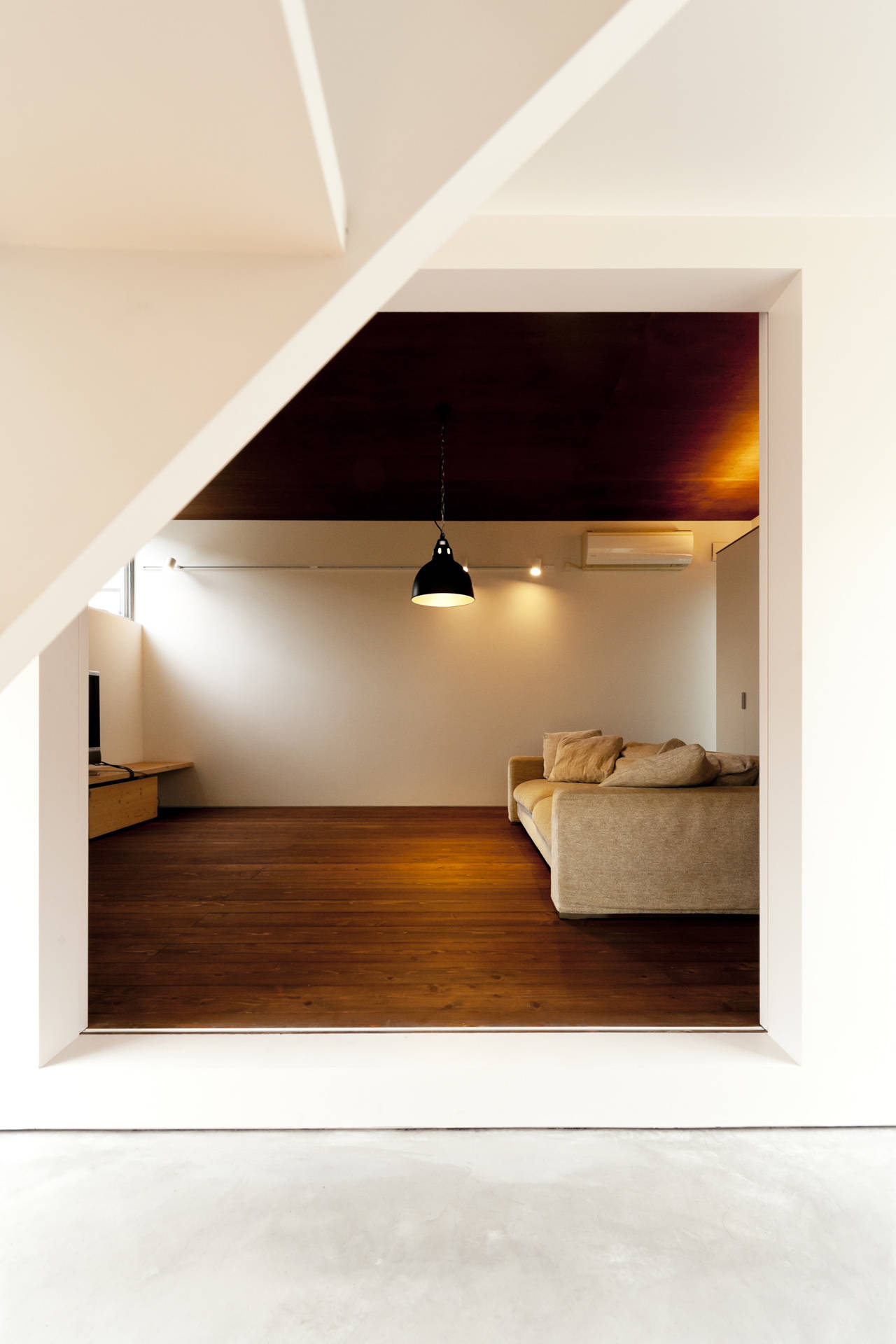 小さな家の中に背の低い真っ白なトンネルを設け、表通りと袋小路を結ぶ道とした。生活は白い道から展開する。そこの上下左右に諸室を配置することで、