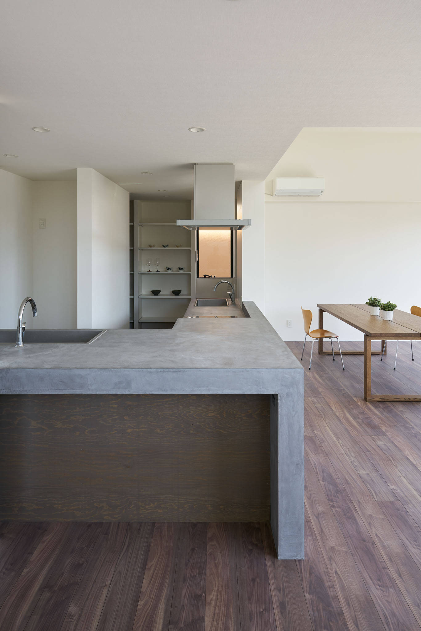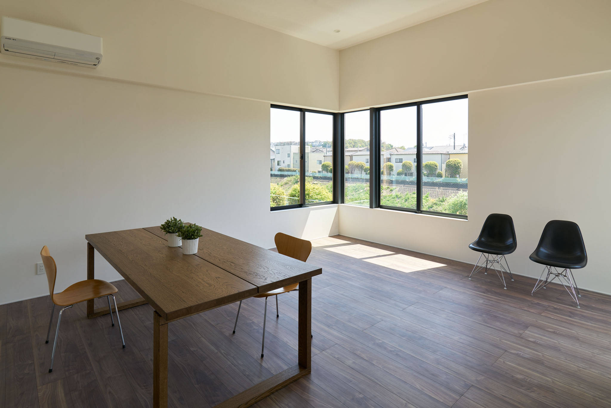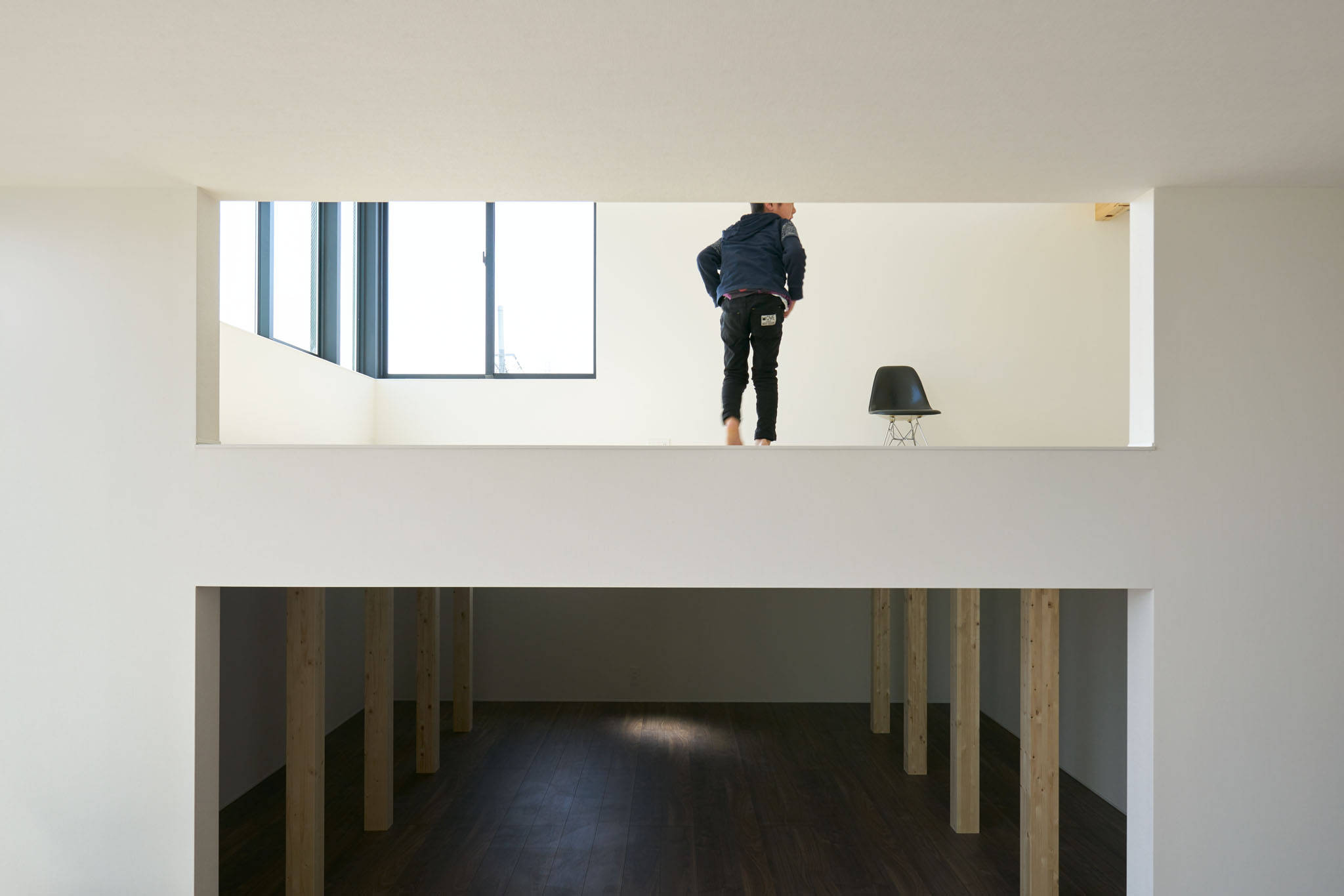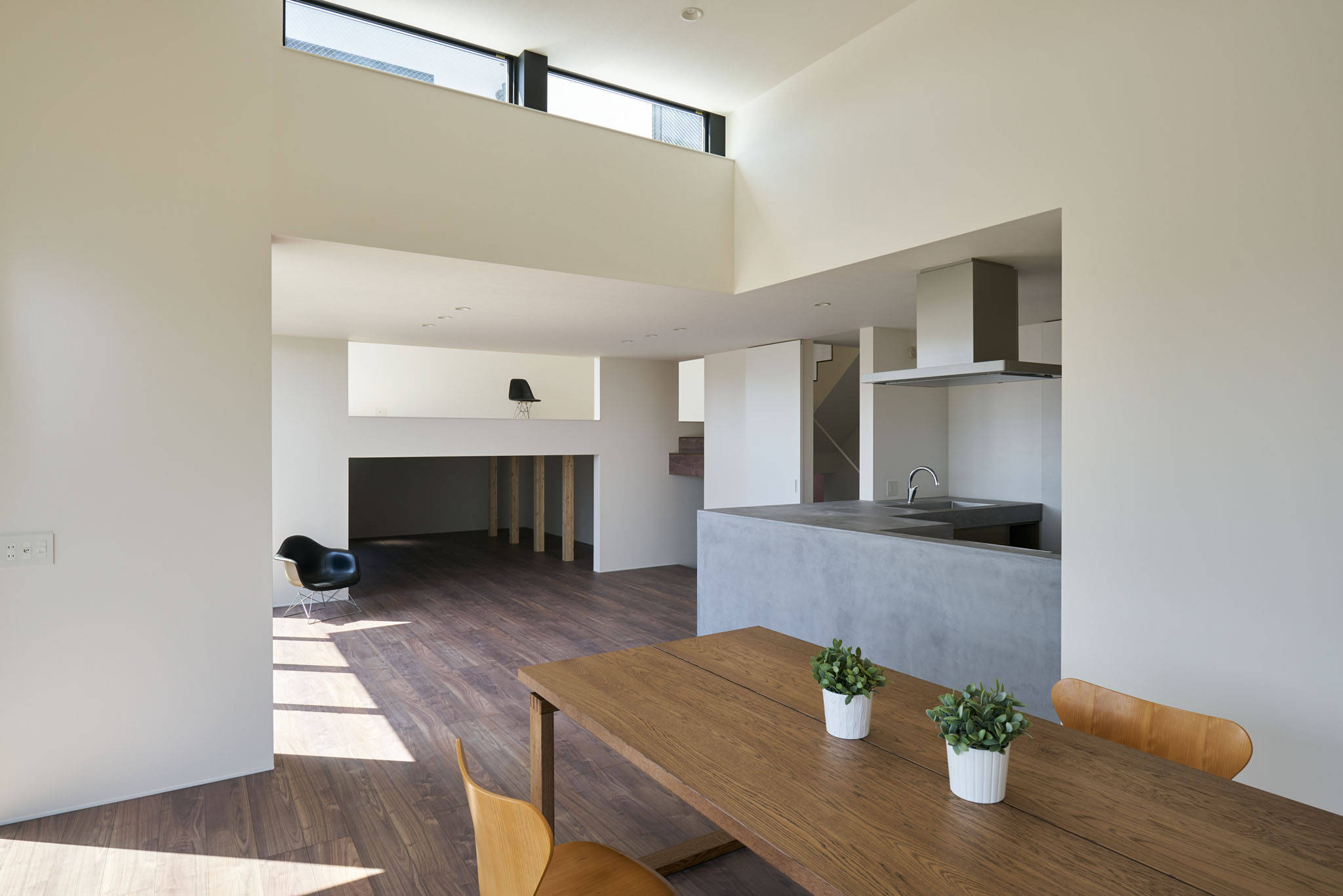 スキップフロアを採用する事で、川沿いの風景や採光を取り込みながら、住宅としてのプライベートな部分は確保し、同時に2階の大空間を、大家族と呼ばれる家族形態に必要なLDKとして成立させています。