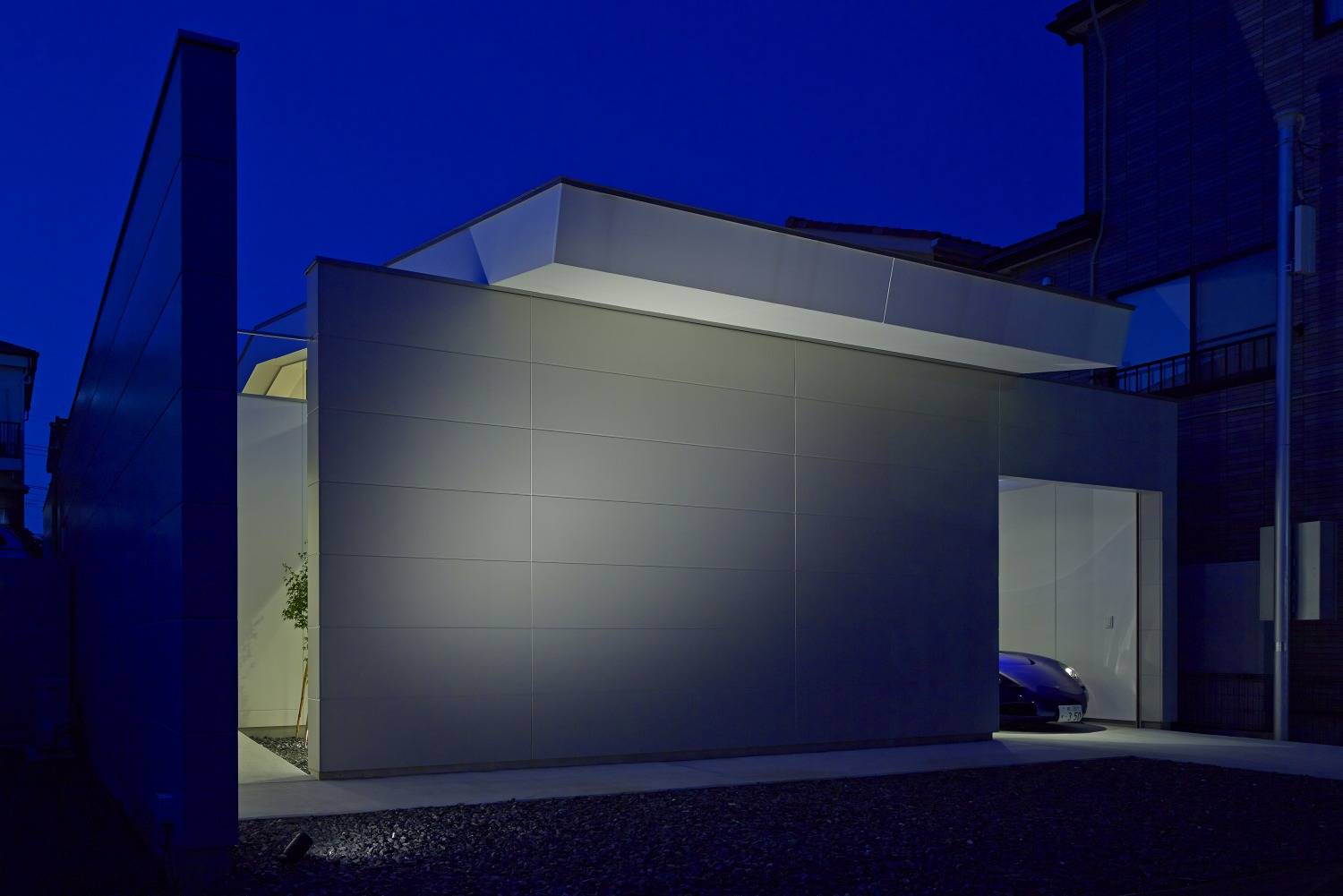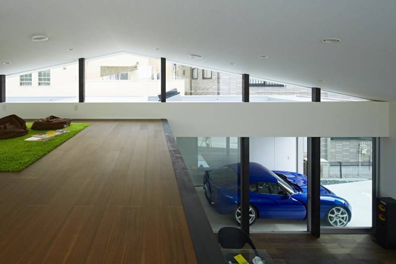 建主の要望は、愛車を内部から鑑賞できるビルトインガレージと、太陽光パネルを設置するための勾配屋根でした。敷地面積に比べて、建主が必要とする面積が、さほど大きくなかった事や、以前は畑であった敷地の地盤の耐力が低かったため、地盤の接地面を大きく確保しながら、重量の軽い木造の平屋での計画としました。