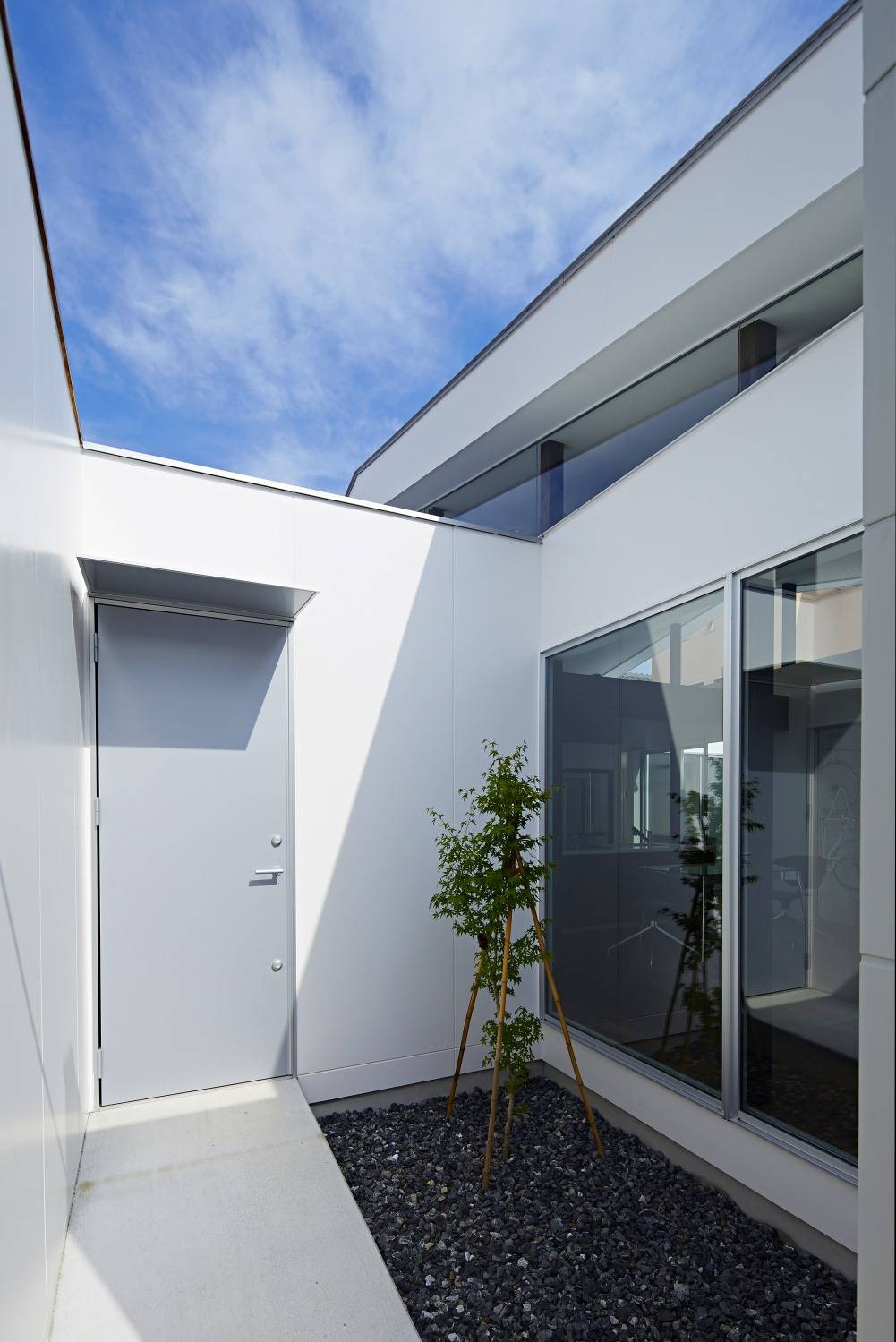 外部には陸屋根による単調な水平ラインに、勾配屋根による内部空間が顕在化したラインが寄りかかる形で現しました。
