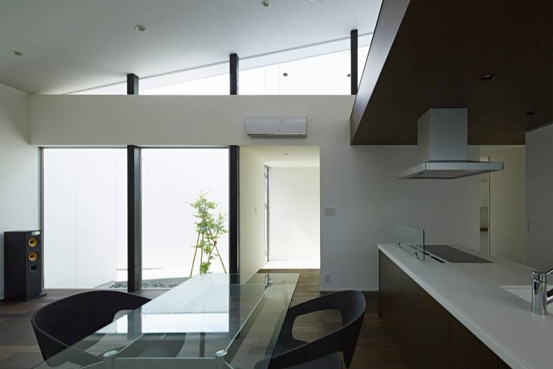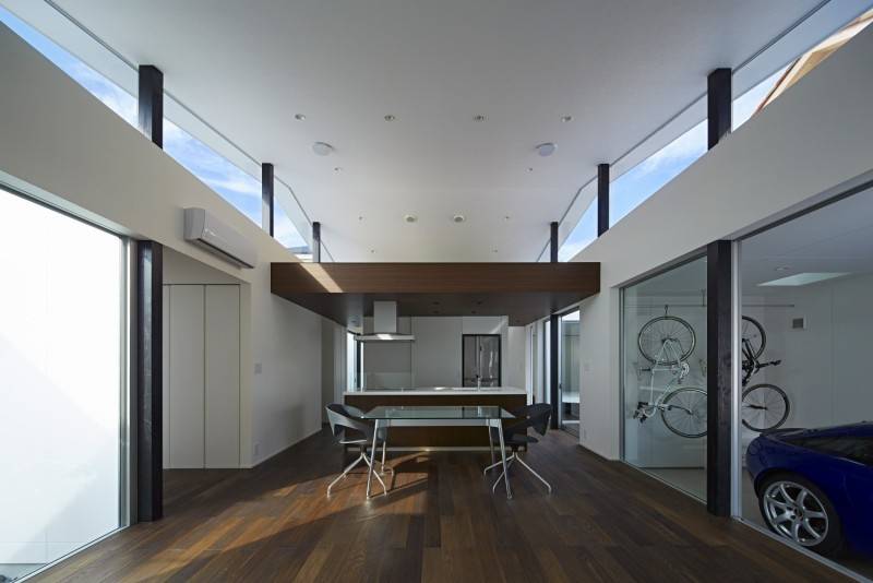 さらに勾配屋根を天井と一体となったプレーンな形状にし、等間隔の柱で持ち上げ、この架構を、東西から陸屋根を持つボリュームで支えました。結果、内部には勾配屋根と、陸屋根のレベル差により開口が生まれ、東西の陸屋根の巾により、平屋の床に隣接する建物を払拭した空が現れた。