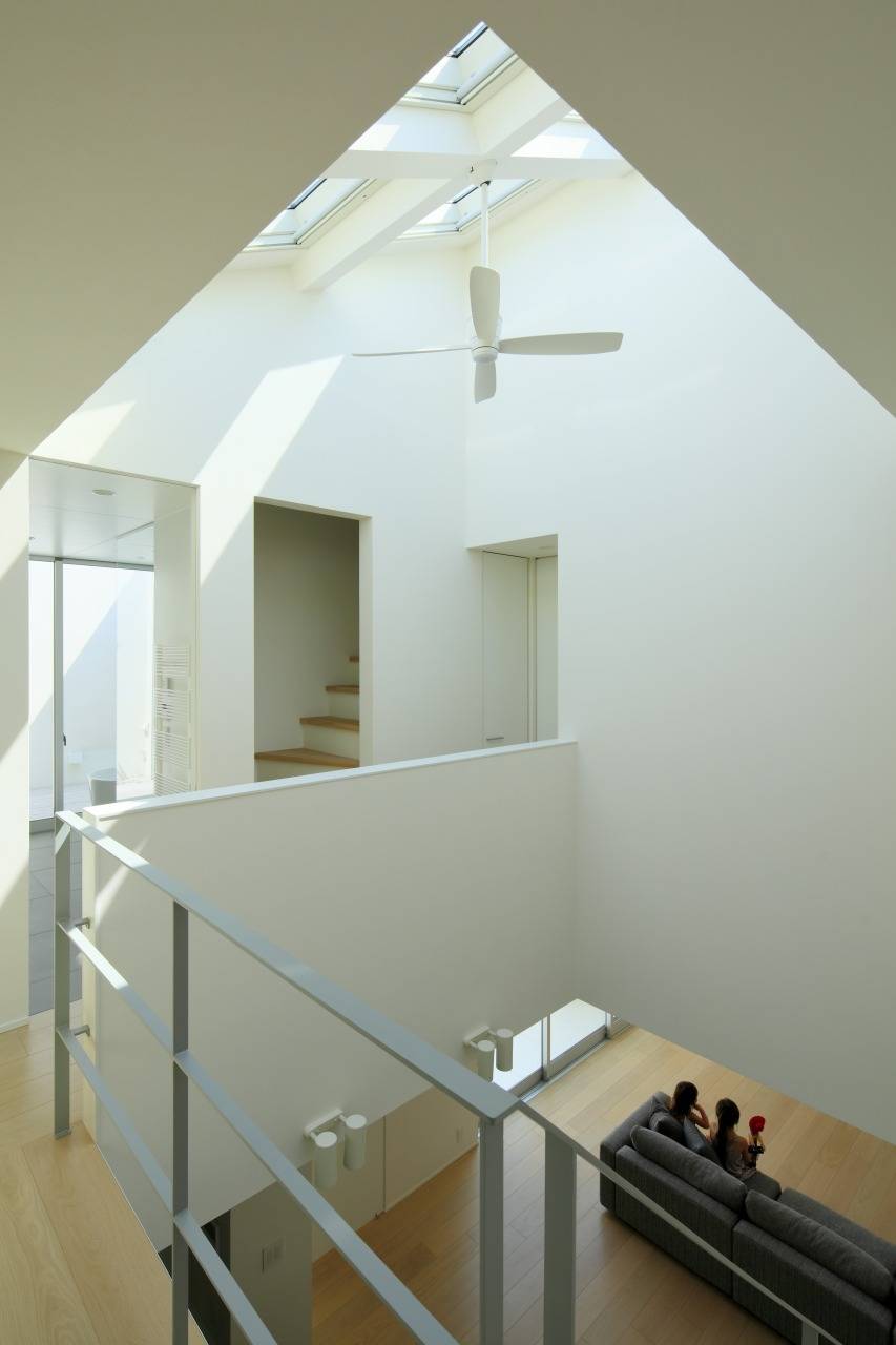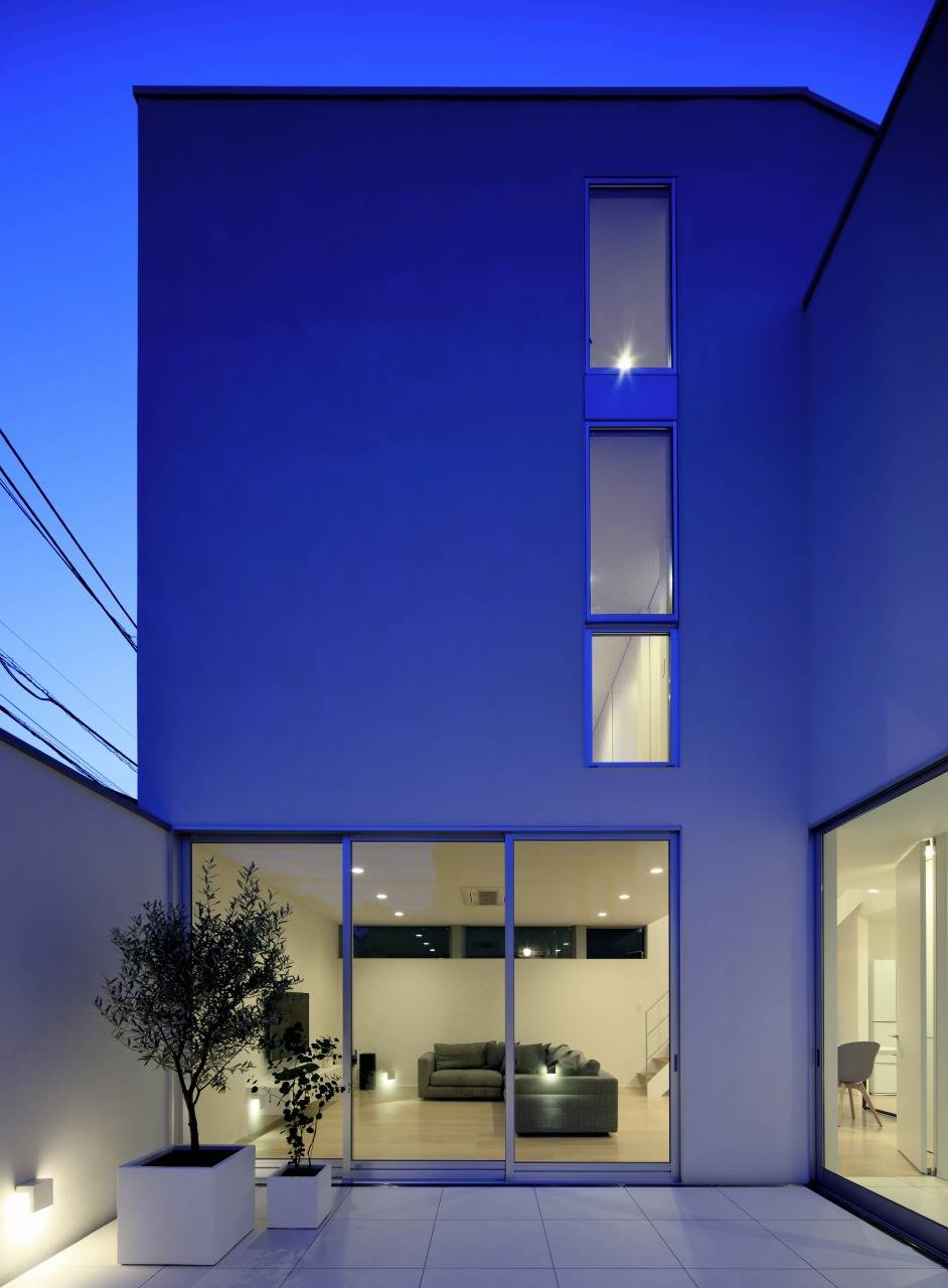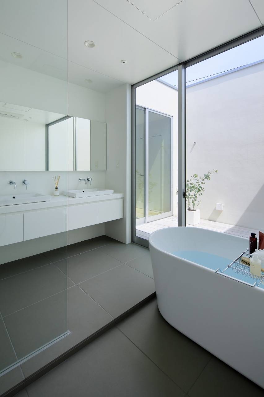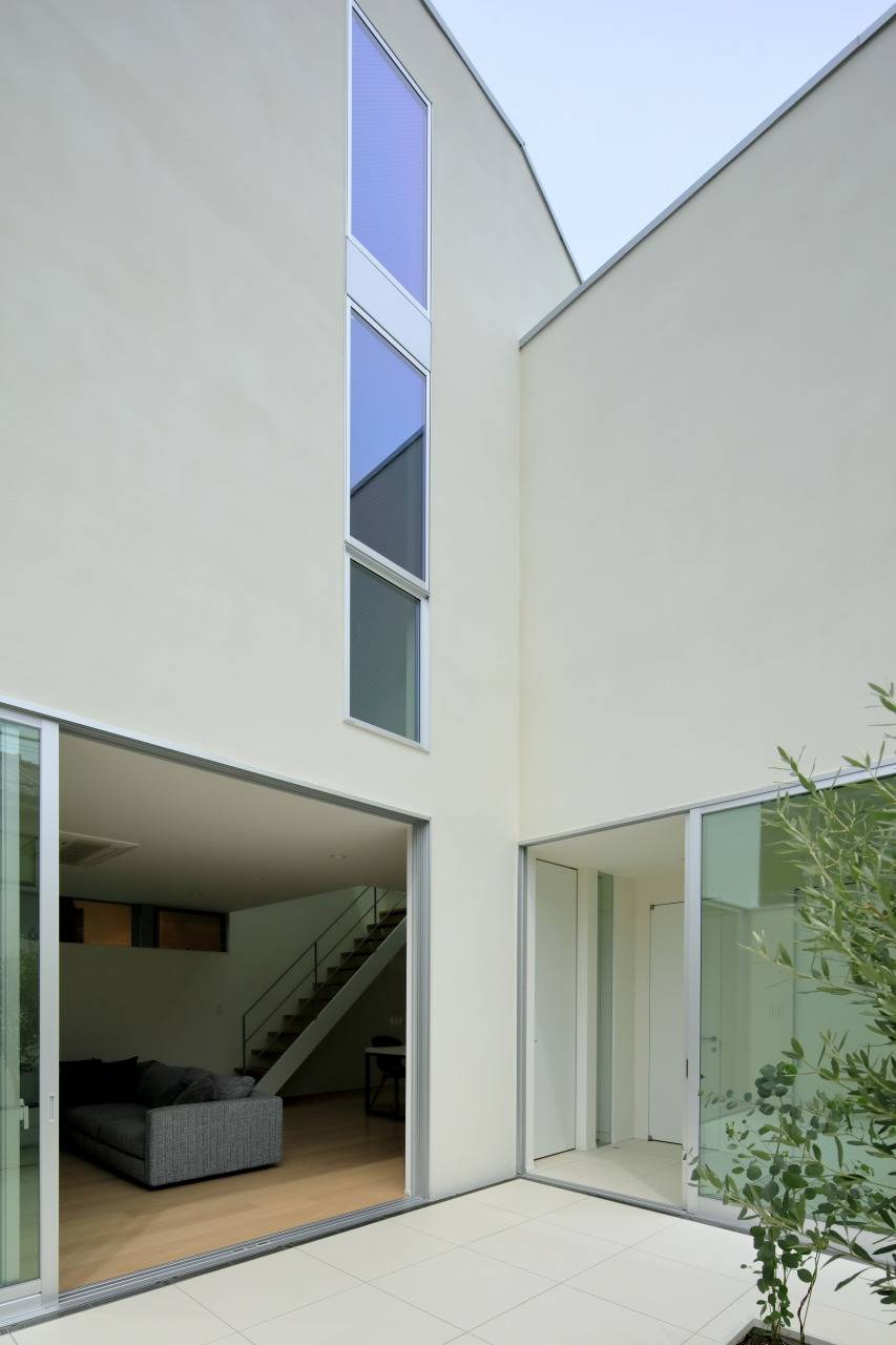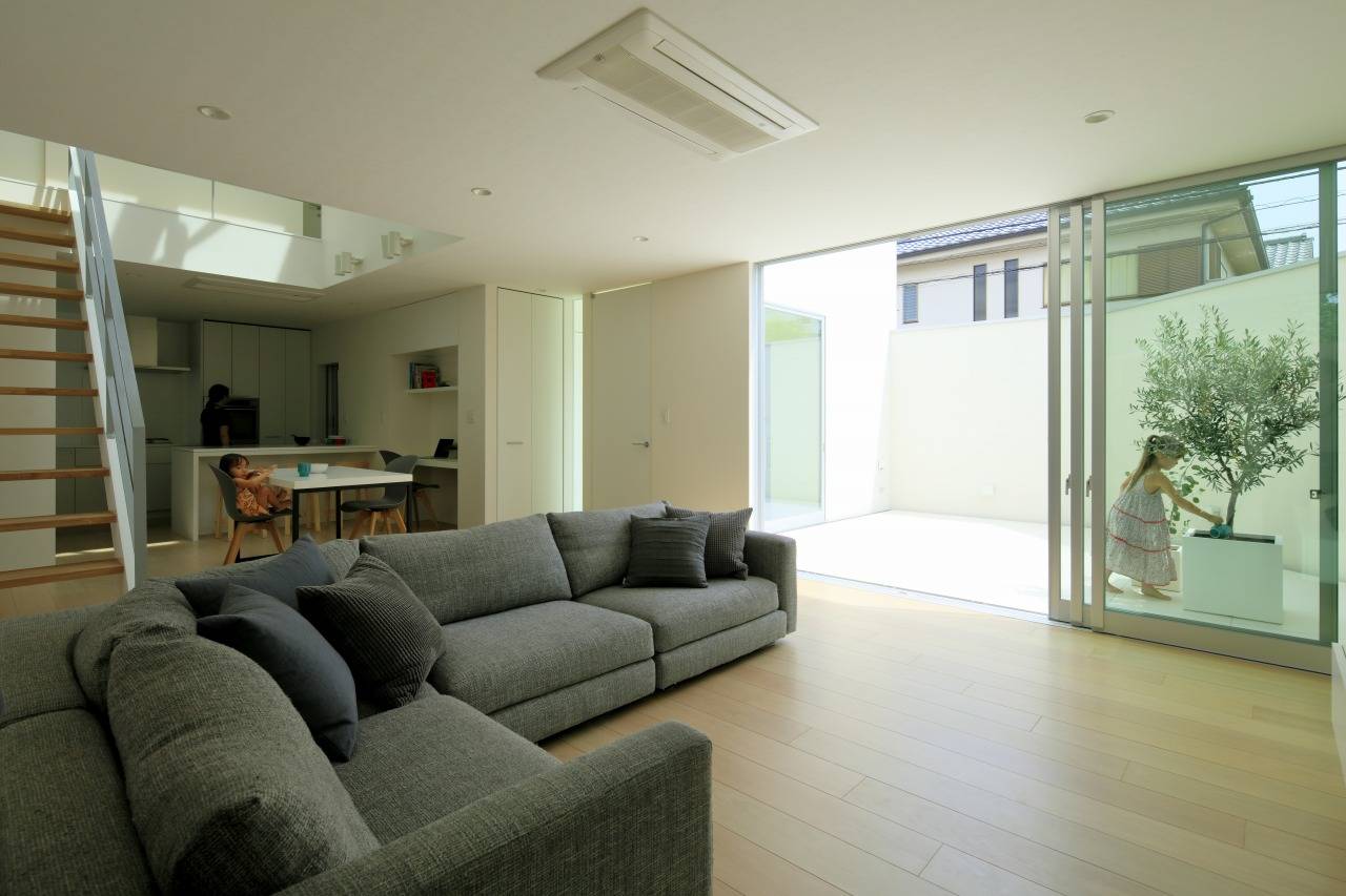 1階の中庭は玄関とリビングを繋ぎ、2階のテラスは洗面室と主寝室とを繋いでいます。