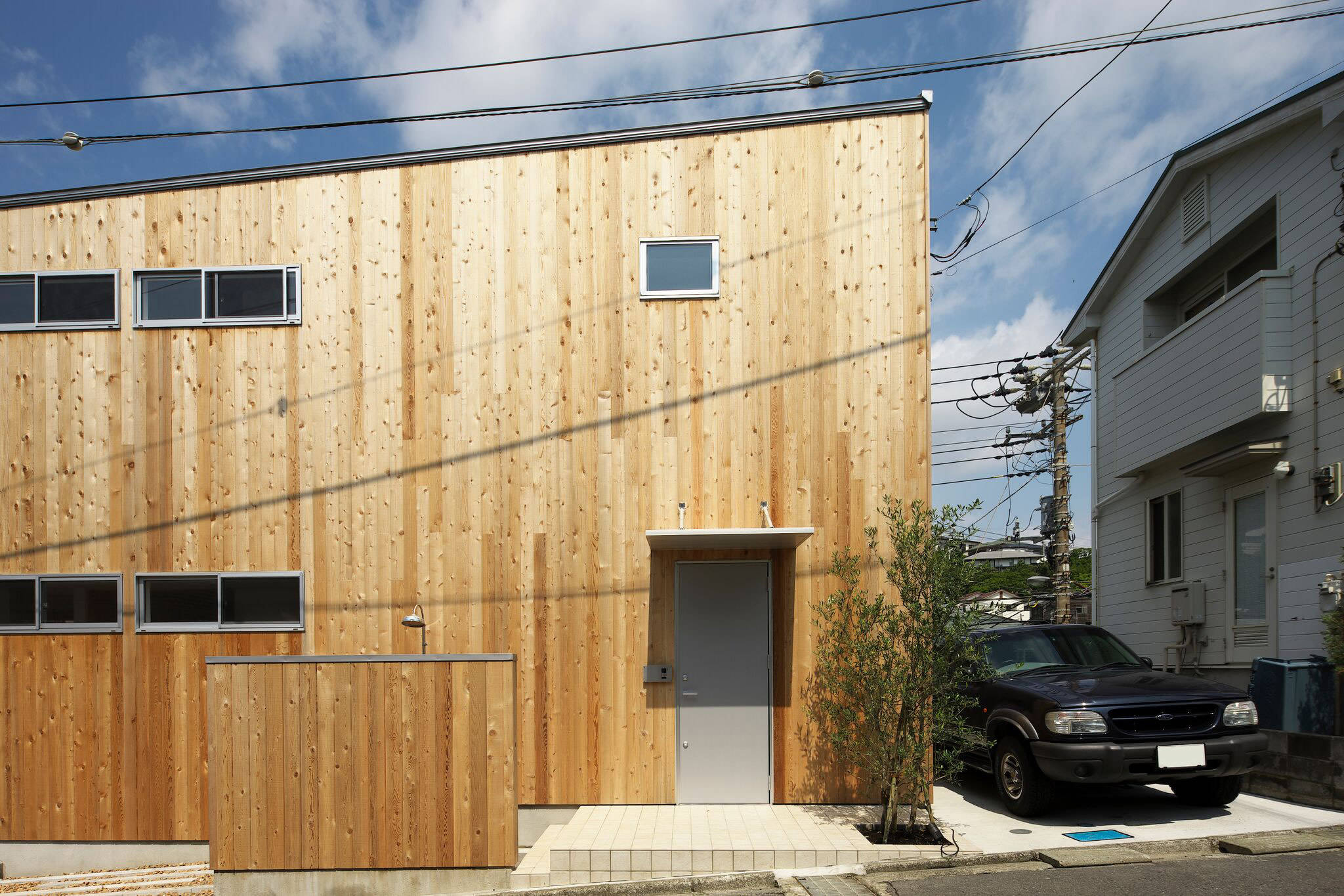 鎌倉七里ガ浜の変形+傾斜敷地に建つ木造2階建住宅。敷地の高低差をプランに取込み、海に向って狭まっていくシンプルでユニークな外観。