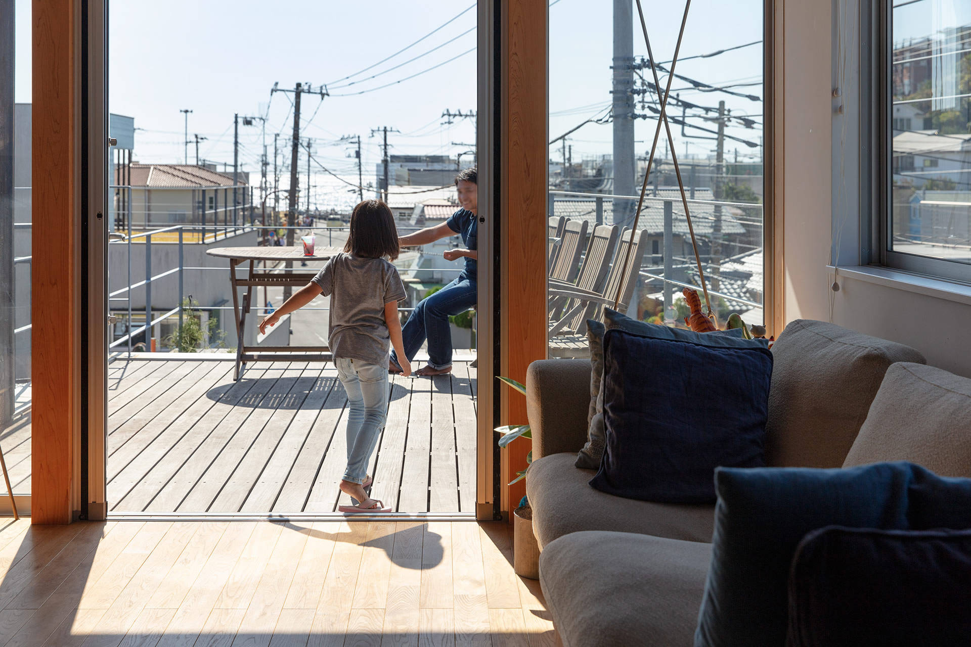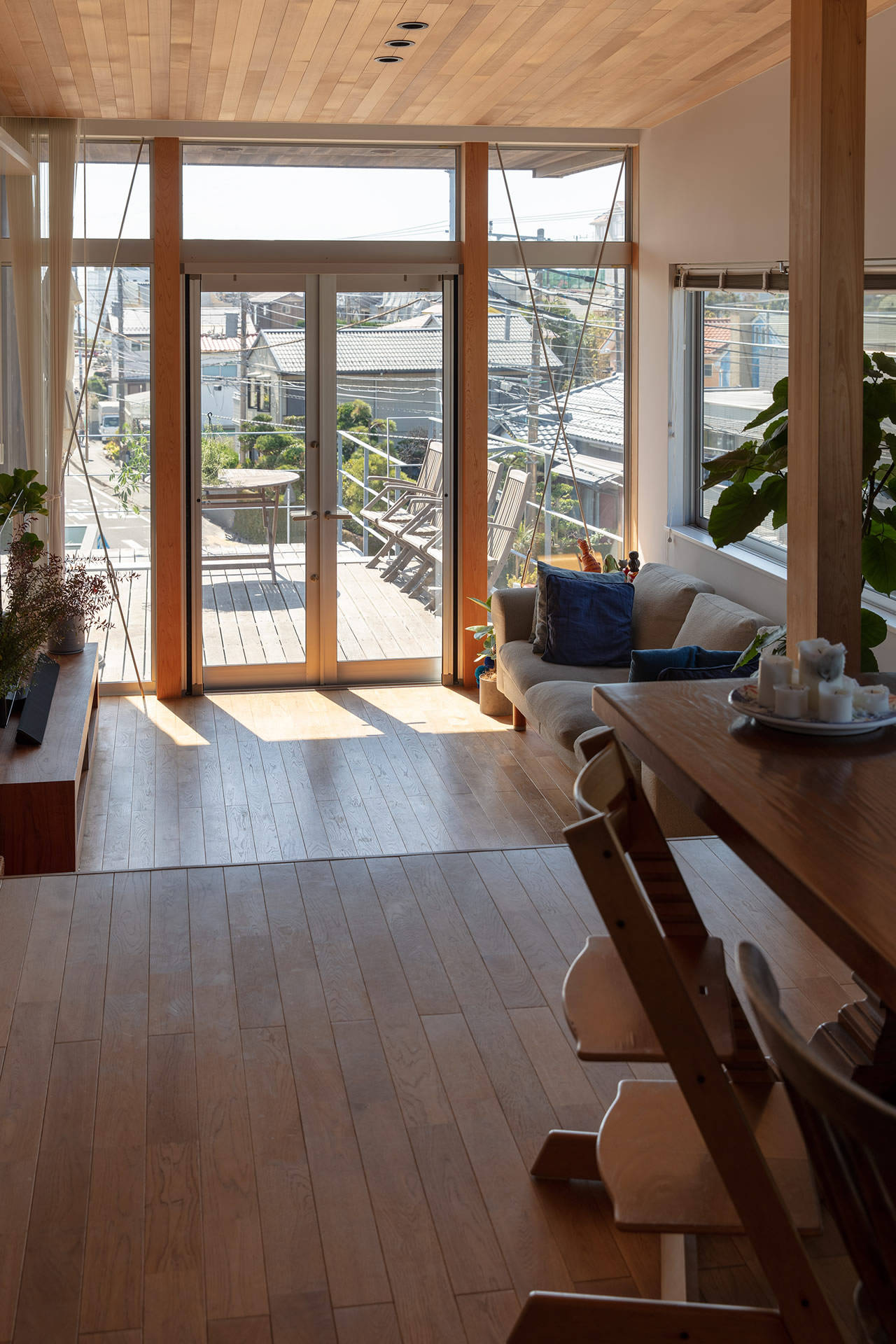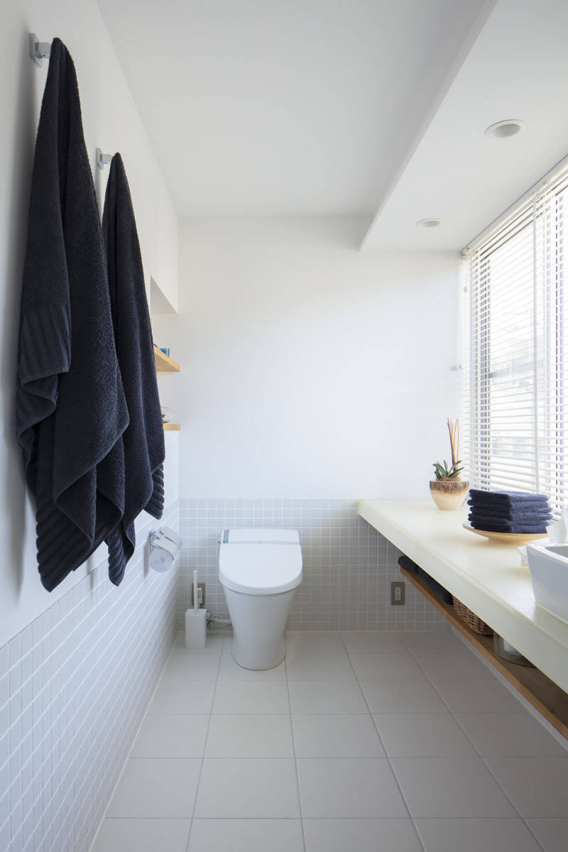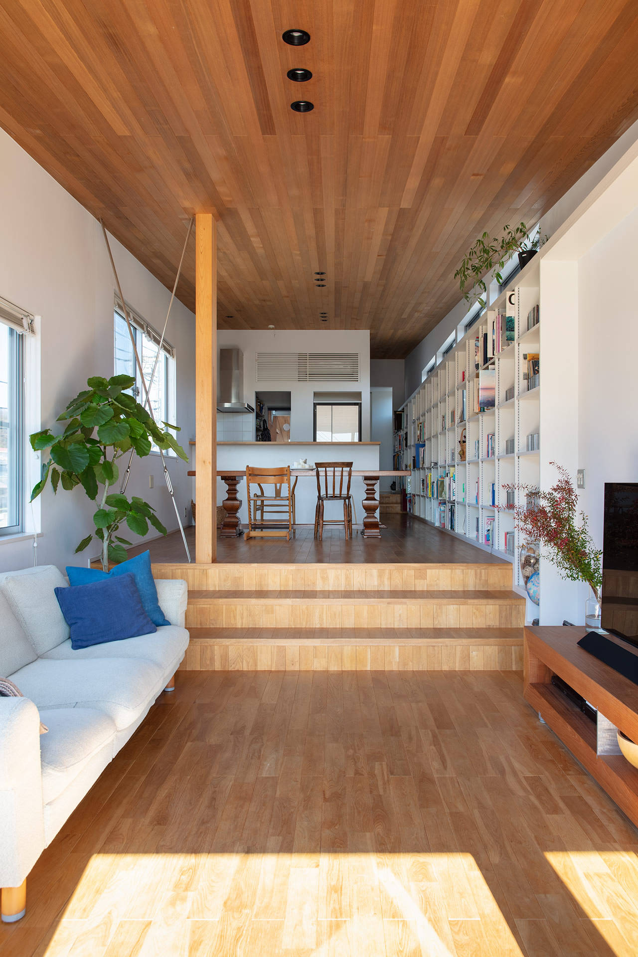 外壁米杉板縦貼、オーク床材、米杉パネリング貼傾斜天井、AEP仕上の壁・天井、業務用ステンレスキッチン、造作浴室などシンプルで丈夫で着心地のよいジーンズのような住宅です。キッチンからデッキの先に見える水平線、11mに及ぶ本棚など厳しい敷地条件を逆手にしたデザインとしています。