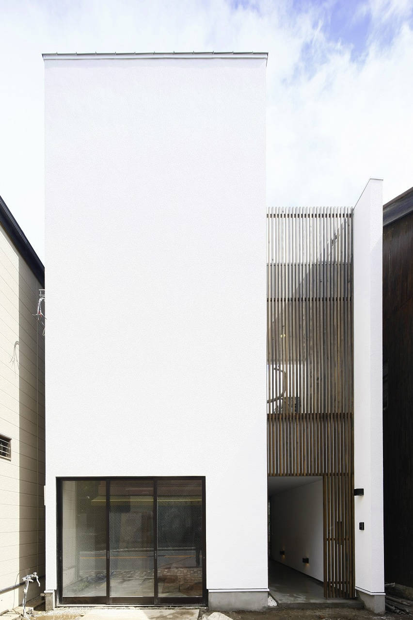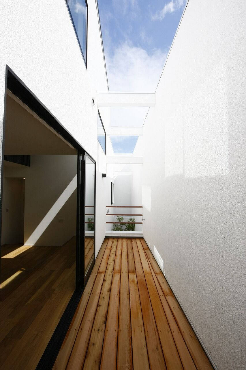 2階バルコニーからは白い壁に切り取られた空だけが見える「ソラニワ」。「ソラニワ」には縦格子を通して内から外にくらしが、外から内には通りの喧騒が制御された形で出入りする。