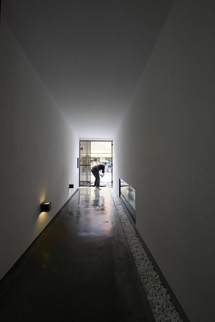 外観は通りに対して白い壁とダークブラウンの縦格子のみのミニマルな設えとして、店が連なる通りの背景となるように配慮した。