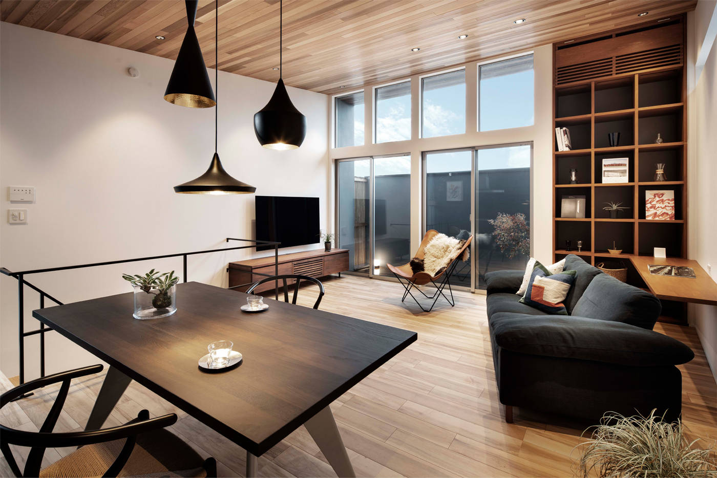 リビングダイニングの天井に軒天井と同じレッドシダーを貼り、視線が自然と外へと向かうことを意図した。窓外に展開する逆T字に延びる街の景色と夕陽に染まる美しい空を眺め時の流れや自然を感じながら暮らせる家になればと願う。