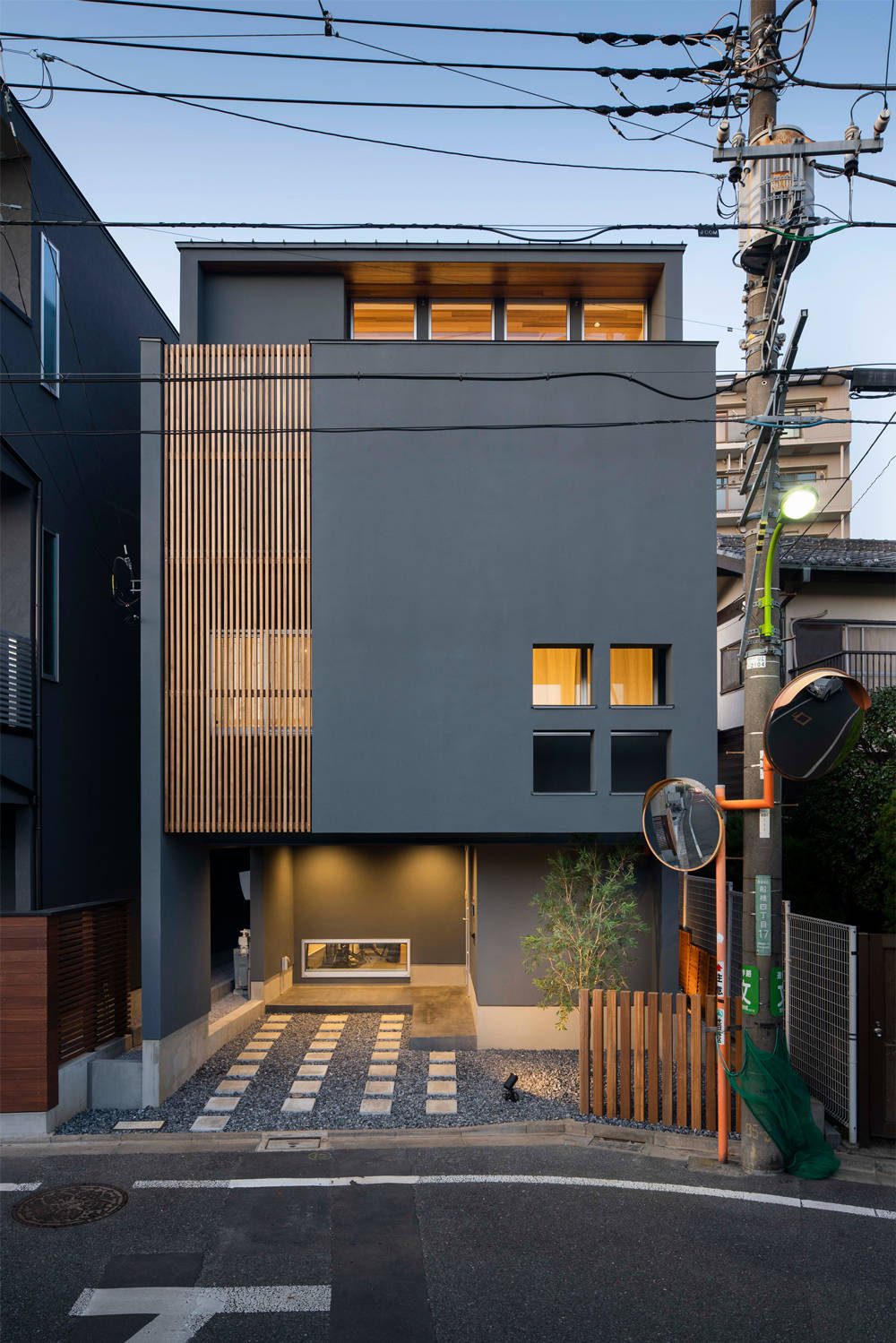 T字路正面にあたるファサードを、ダークグレイ外壁面、サーモウッド縦格子、レッドシダーパネリング軒天井、門型フレームを使ったコンポジションによってバランスを整える設計とした。ダークグレイ色は街に馴染みつつ個性的となるように施主と慎重に検討を重ねて選定した。縦格子やレッドシダーが経年変化しても背景となる色になったと思う。