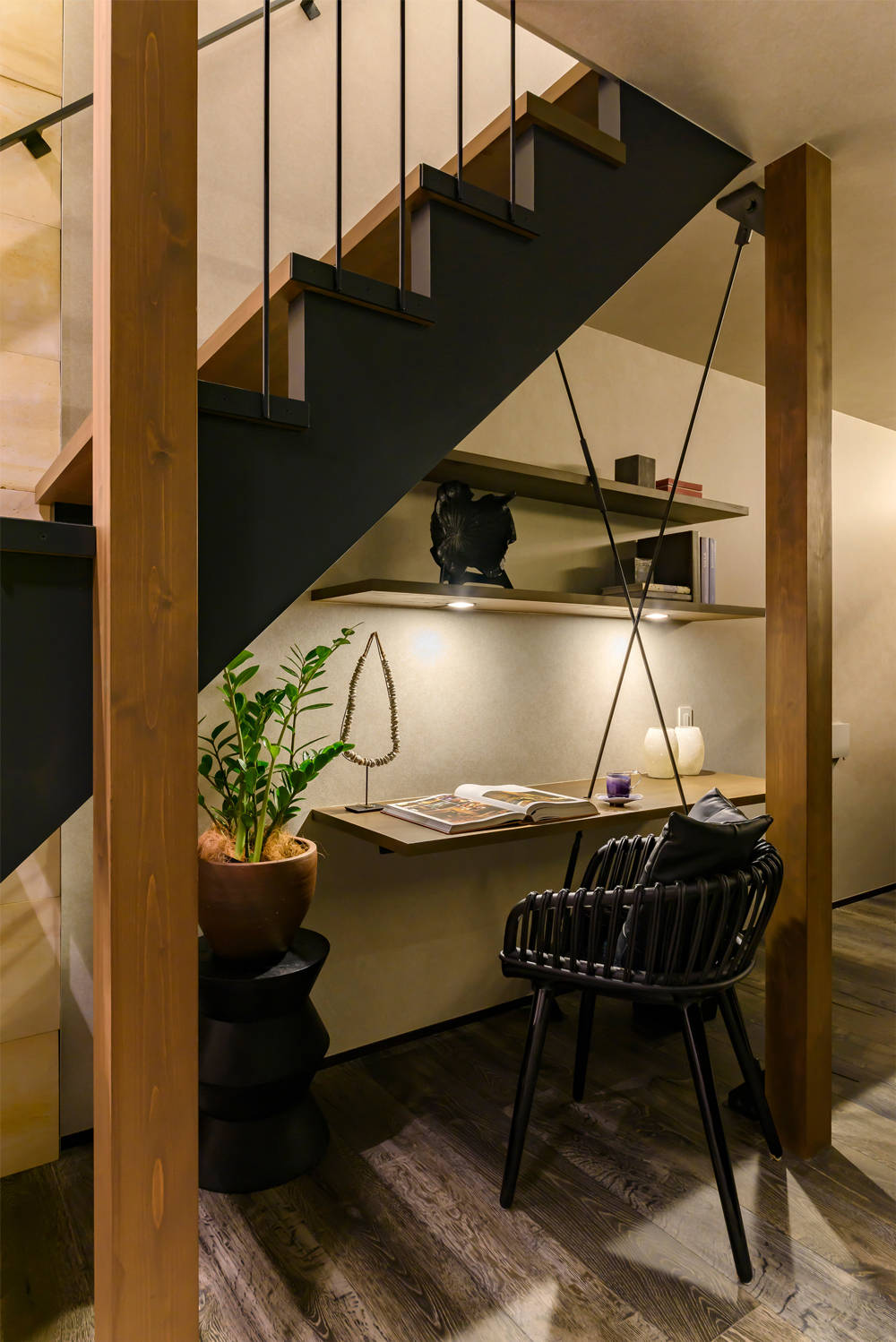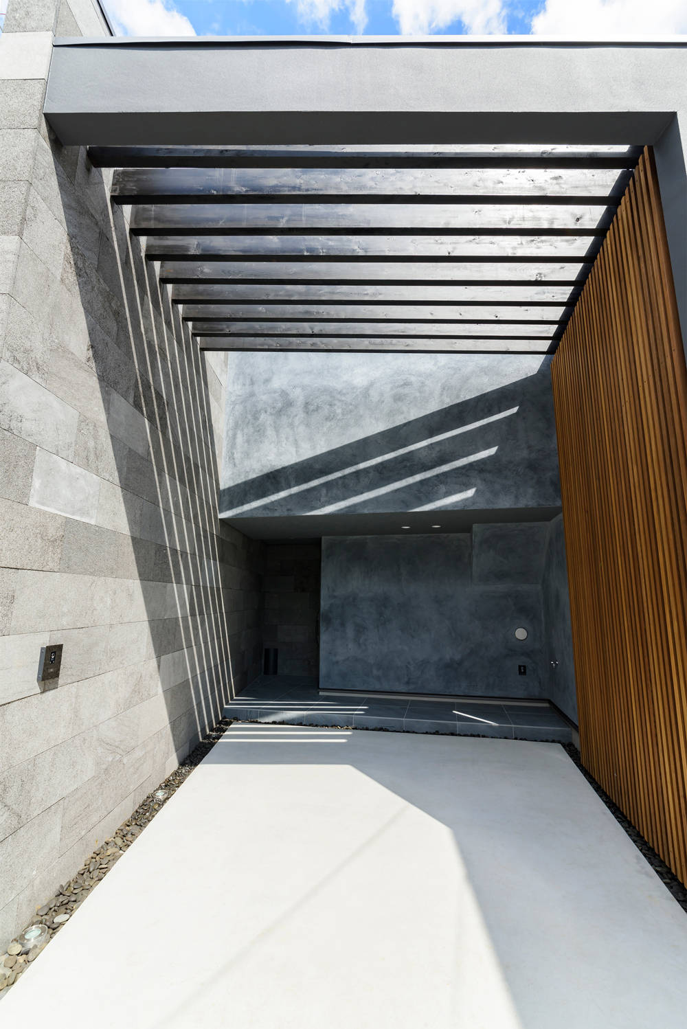 鎌倉七里ガ浜の変形+傾斜敷地に建つ木造2階建住宅。敷地の高...