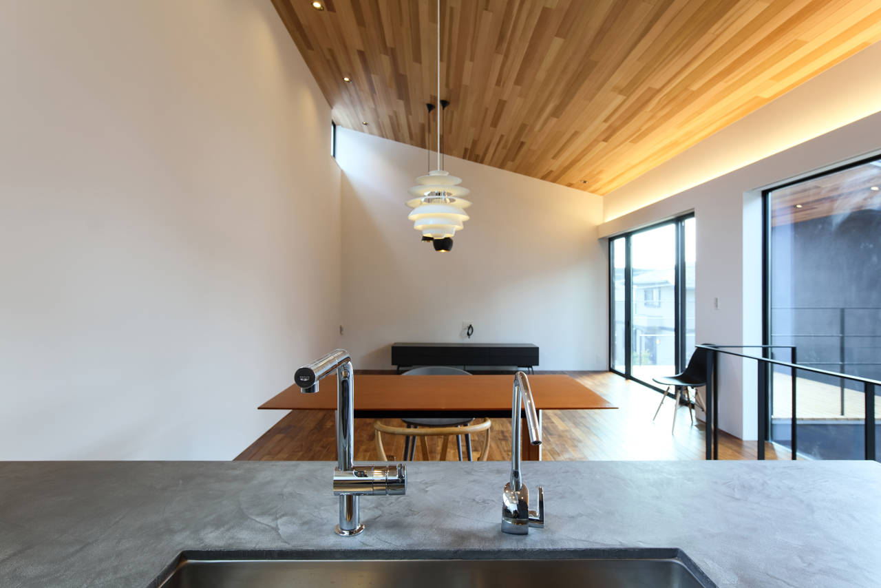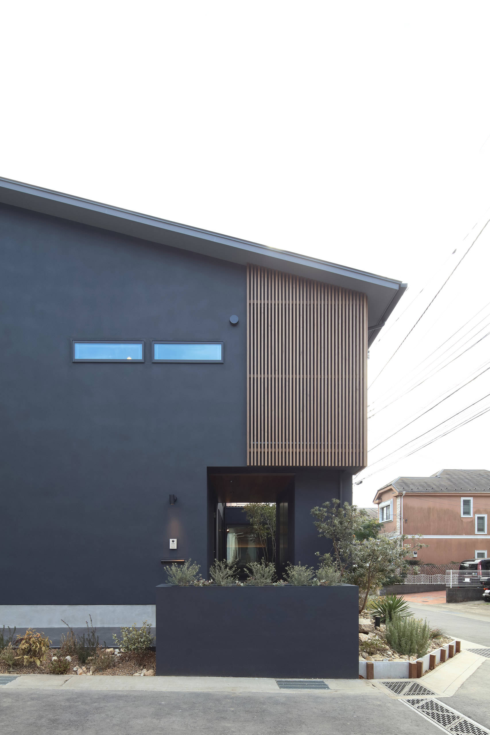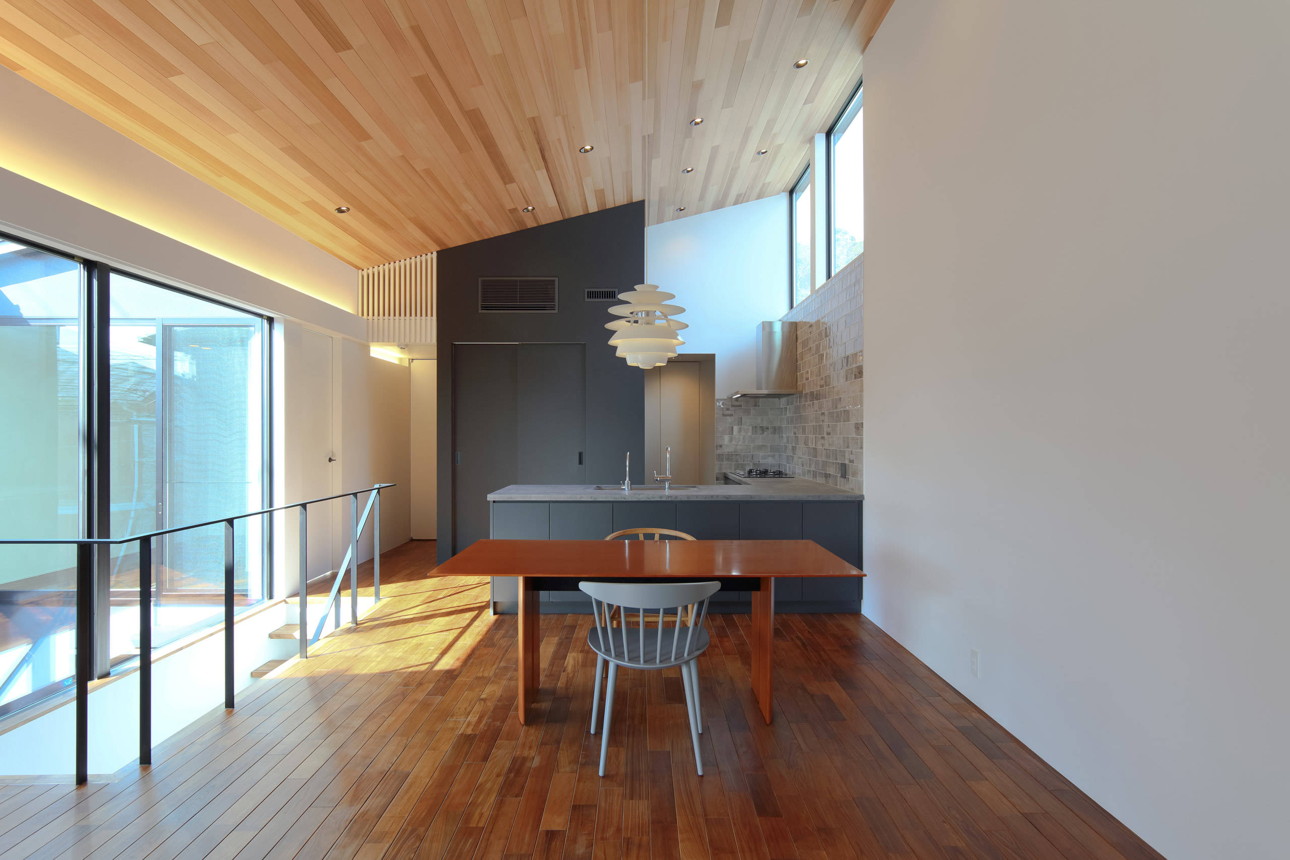 屋内と屋外をシームレスにつなぐ空間を共用部とセットにしたことで間取り的役割を超えたアクティビティを包容する。省エネルギー対策等級4程度とし全熱交換機とエアコン2台で冷暖房を賄う。「通り土間の家」の南隣角地で隣り合う敷地を同時に設計できたことで、隣棟間隔、窓位置などの配慮により境界フェンスをなくし、開けた環境となった。