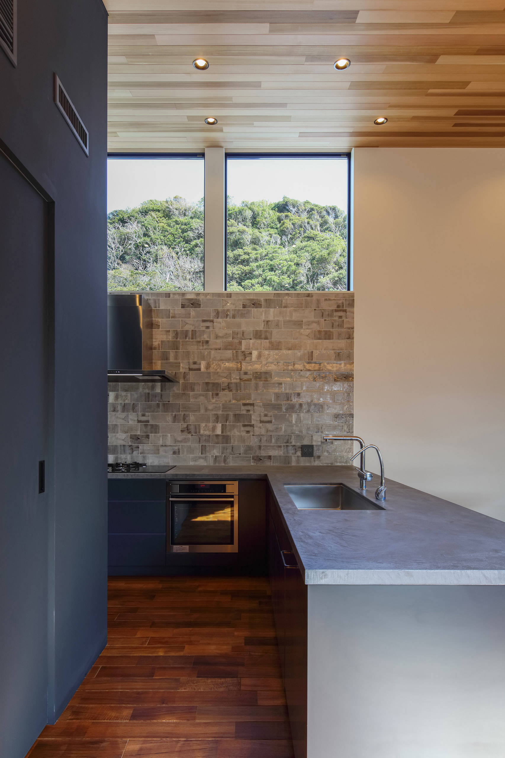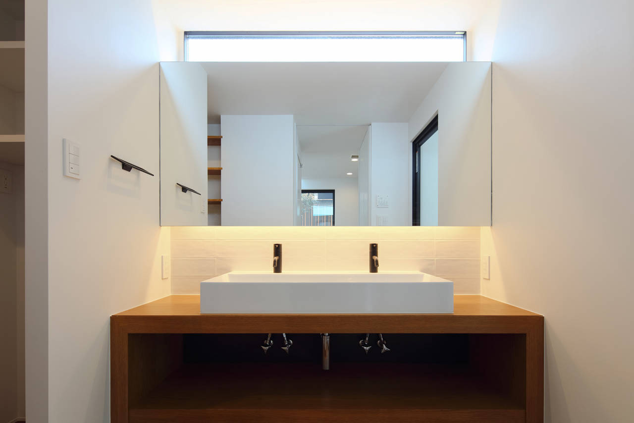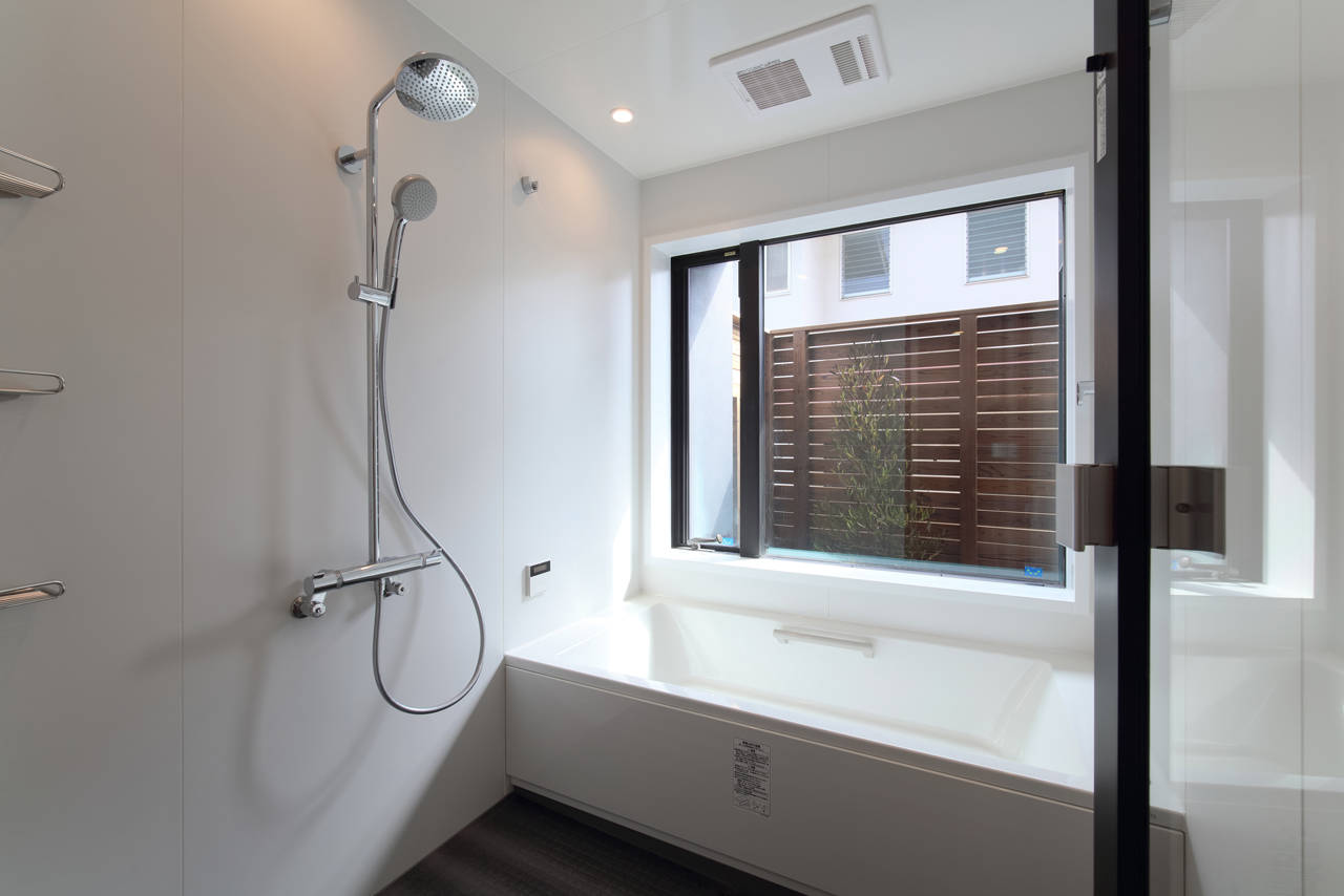 屋内と屋外をシームレスにつなぐ空間を共用部とセットにしたことで間取り的役割を超えたアクティビティを包容する。省エネルギー対策等級4程度とし全熱交換機とエアコン2台で冷暖房を賄う。「通り土間の家」の南隣角地で隣り合う敷地を同時に設計できたことで、隣棟間隔、窓位置などの配慮により境界フェンスをなくし、開けた環境となった。