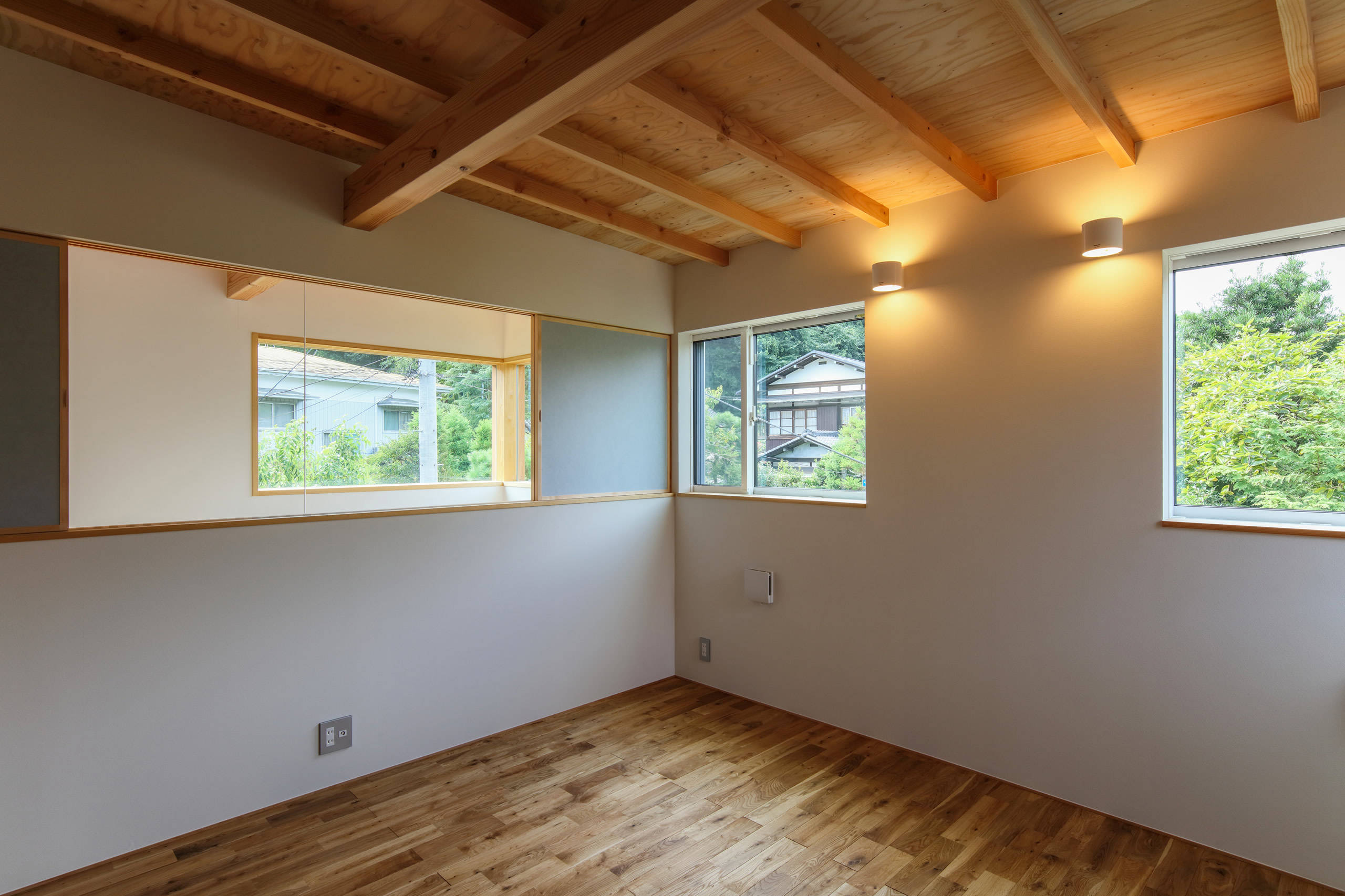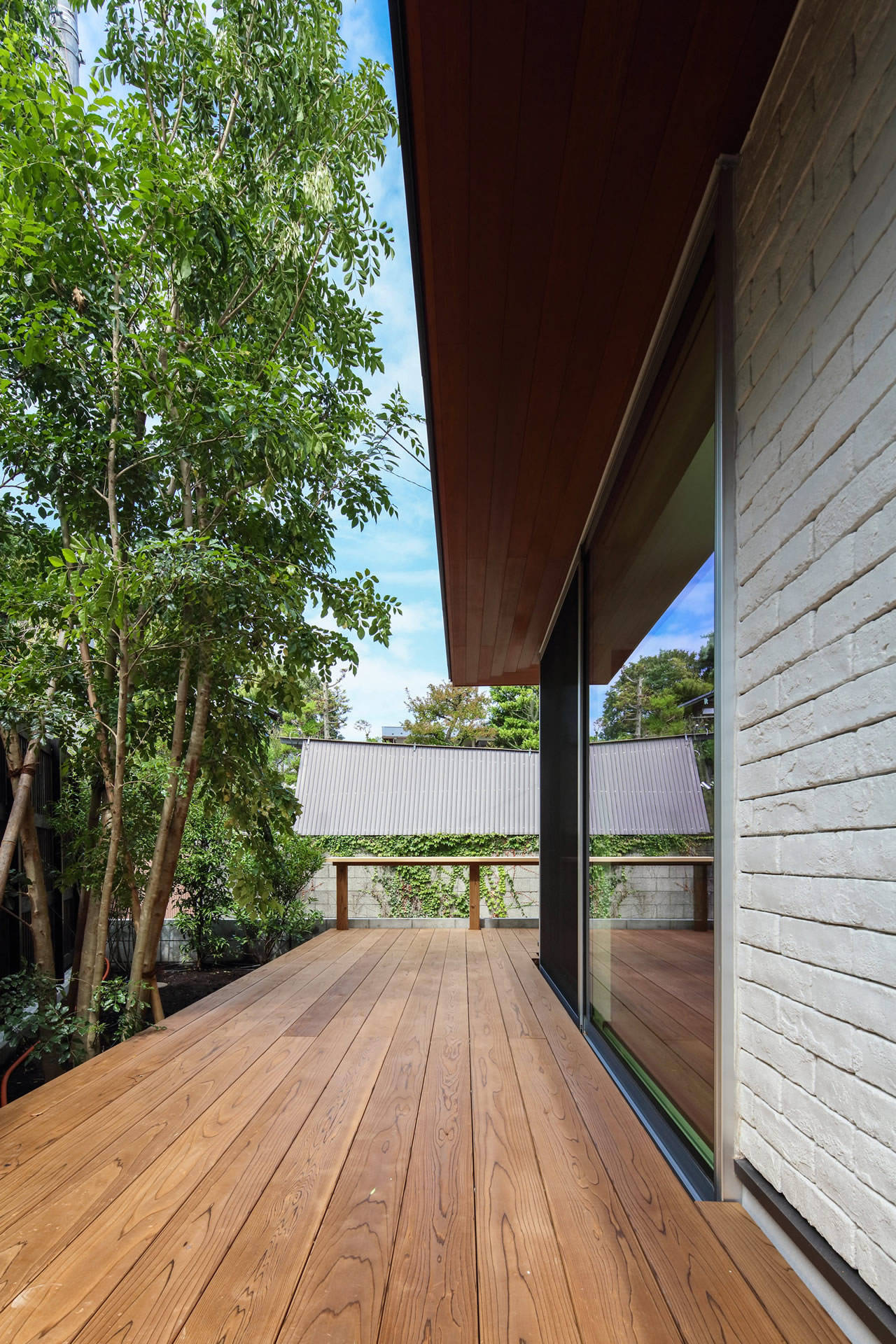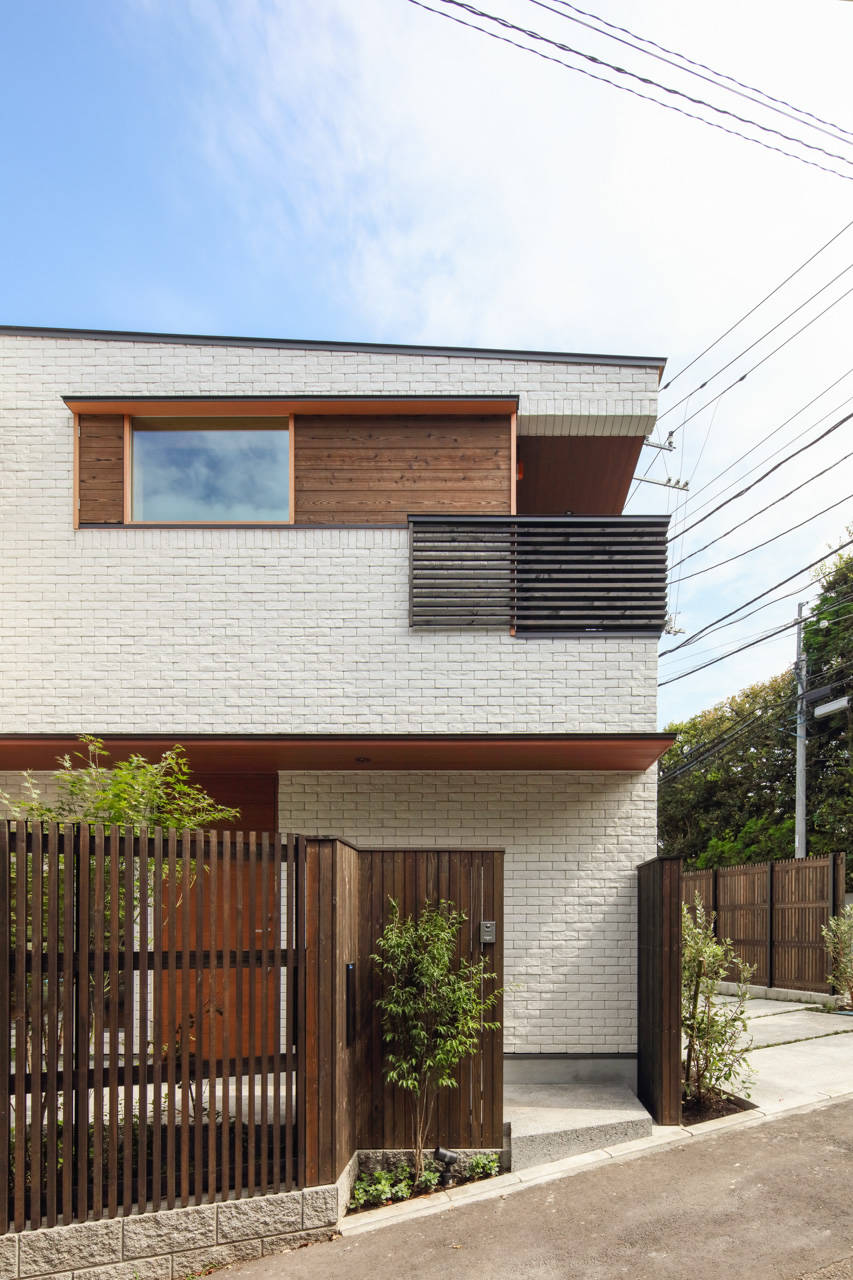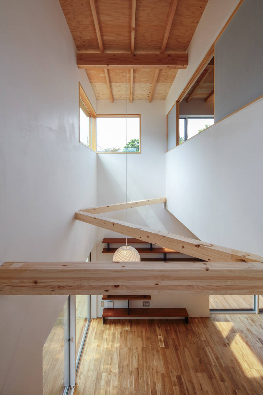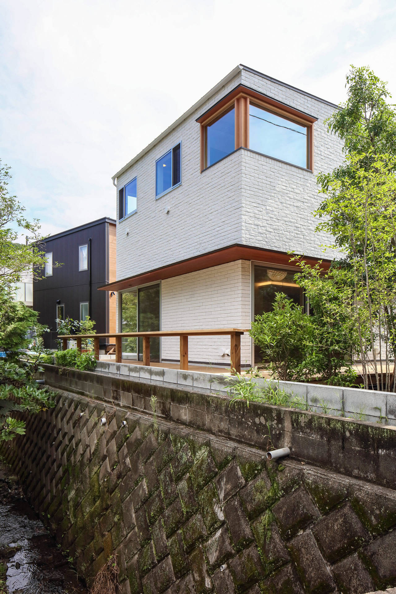 床高を地面に近づけ川岸の緑との一体感を、床高の変化は水平の広がりを印象的にすることを意図した。屋根は外断熱で垂木・野地板をあらわし、他は漆喰仕上げ、床はオーク無垢材の節有り、敷地形状に合わせずらして配慮した白いタイル張りの四角い箱の2階東面を欠取り、焼杉・横格子・開口部を水平ライン上に配し陰影のあるモダンな外観とした。