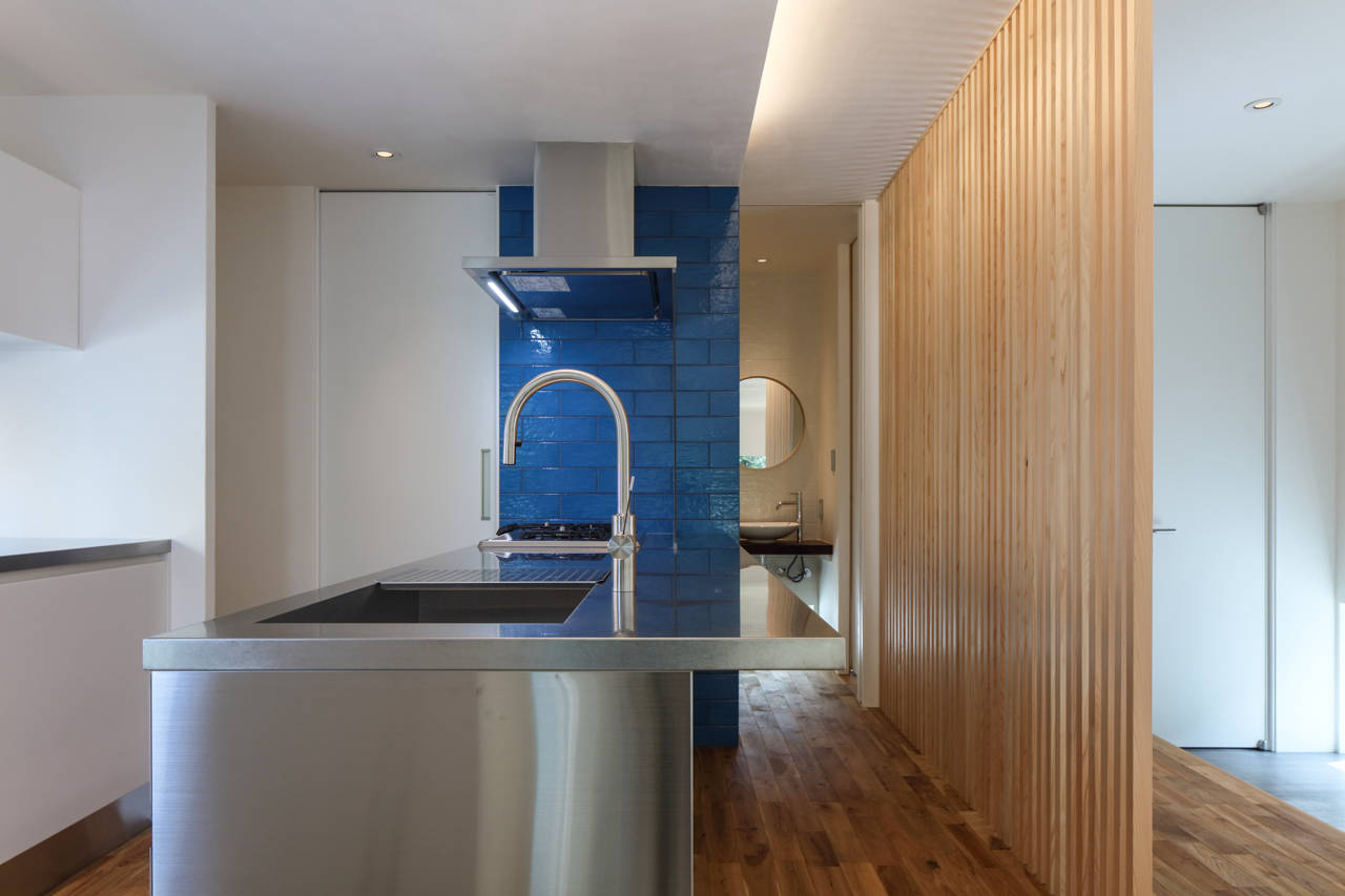 敷地は鎌倉市山ノ内、小袋谷川に流れ込む小さな水路(西瓜川)に面した敷地。向こう岸には樹木が覆いかぶさり風情のある佇まいが残る。東側前面道路から川に向って下がっていく敷地断面を活かしダイニングからスキップダウンしたリビングを通して向こう岸の緑をピクチャーウインドウとして取込む計画とした。