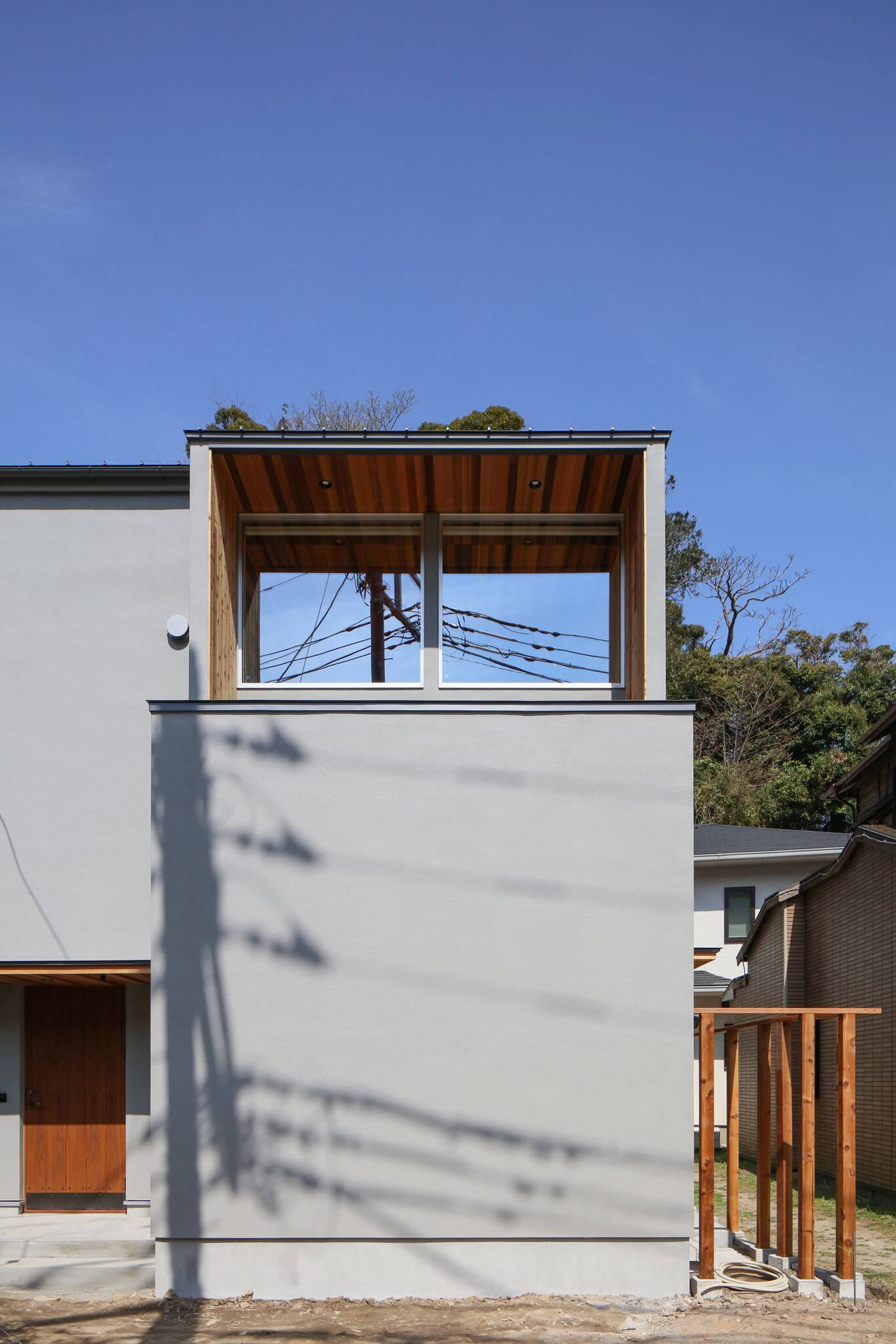 南側と東側には隣家がせまり、北側と西側は4mの道路を隔て住宅はあるが屋根の先には山の緑と空が広がり視線が抜けて心地よい。この風景を捕まえるように窓位置を決め、外部(自然)と内部がつながるように天井と軒裏を同じレッドシダーで仕上げた。