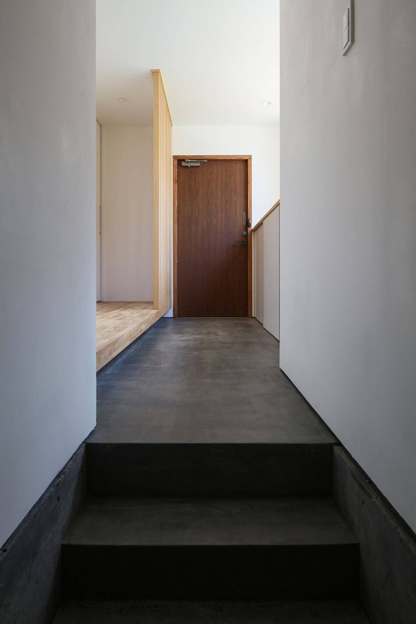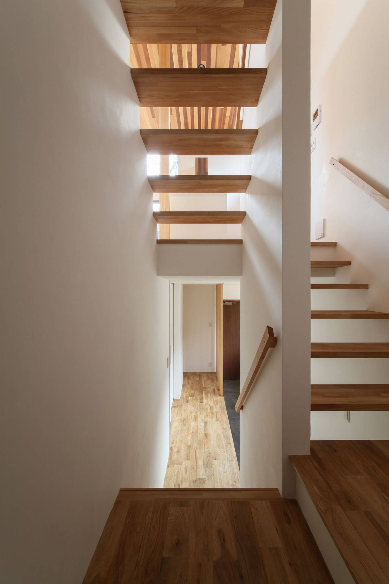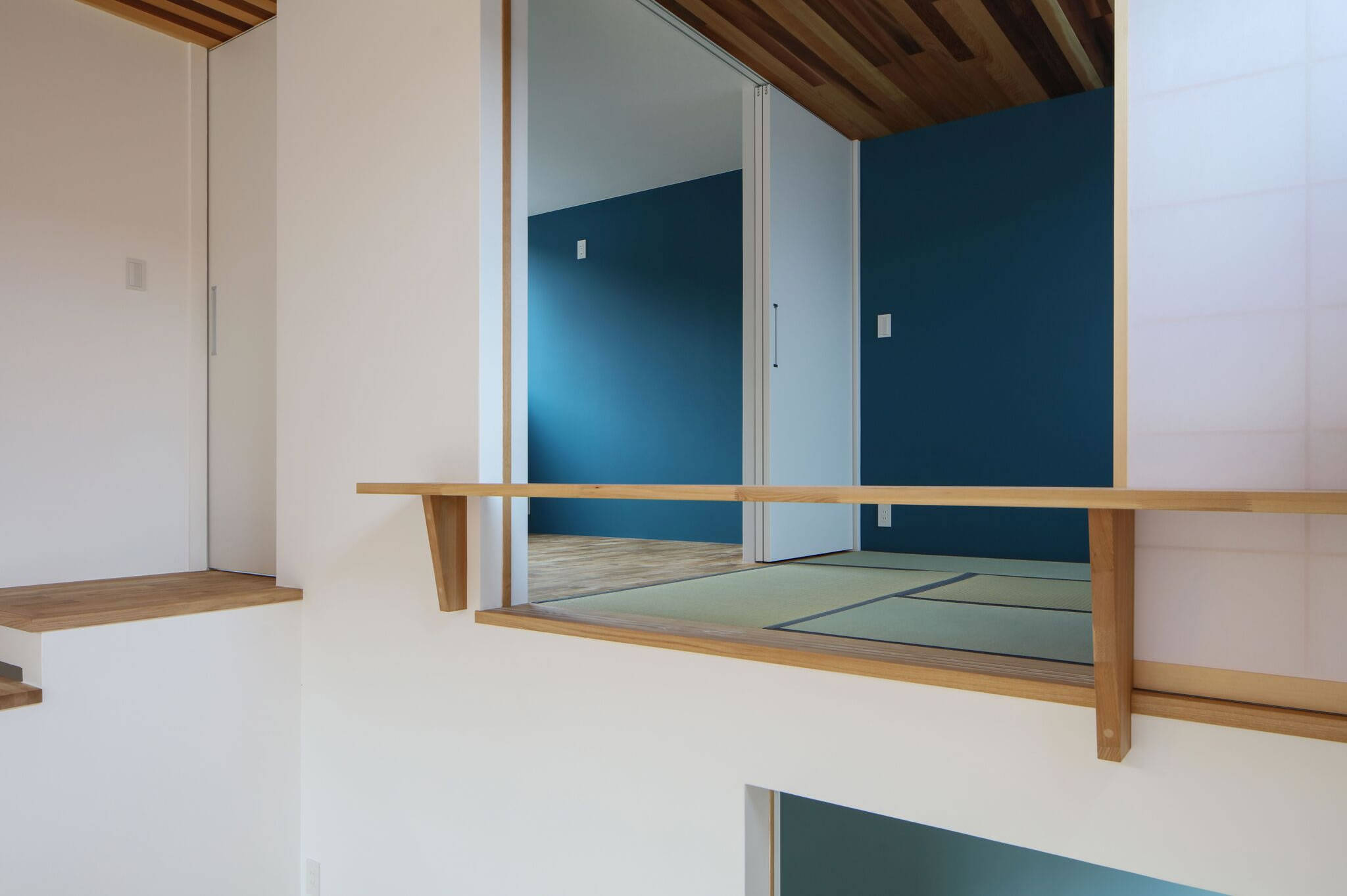断面構成はスキップフロアでワンルーム状にゆるくつながりどこにいても家族同士の気配が伝わる計画とし、床下の余剰空間を収納スペースとして有効利用している。リビングから見える東側の壁を1.5階子供室は薄いソフトブルー、2.5階はピーコックブルーのアクセント色とすることで、この家の断面特性をより強く感じることになった。キッチン脇の桧の四寸柱に愛息子さんの成長が刻まれていく。