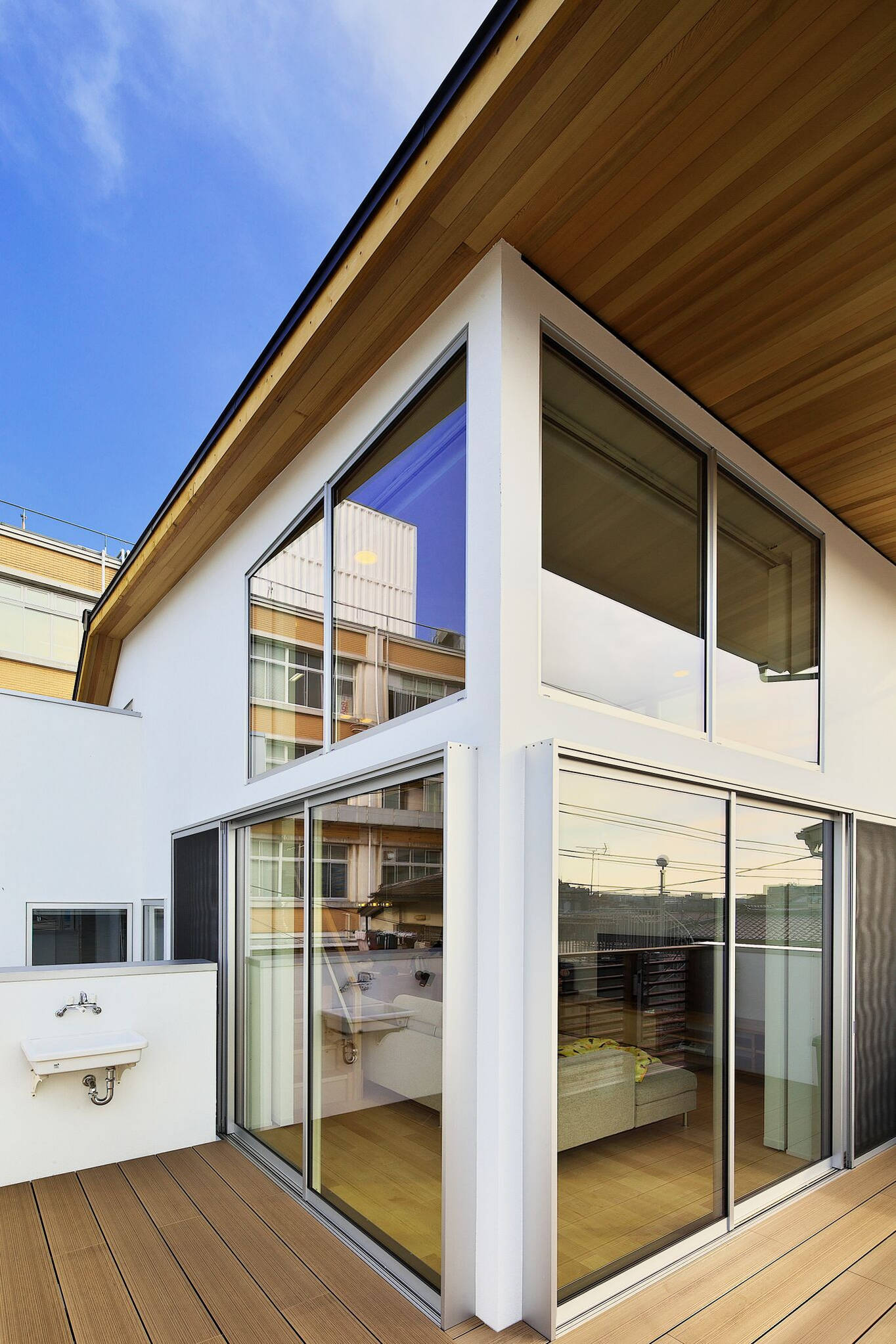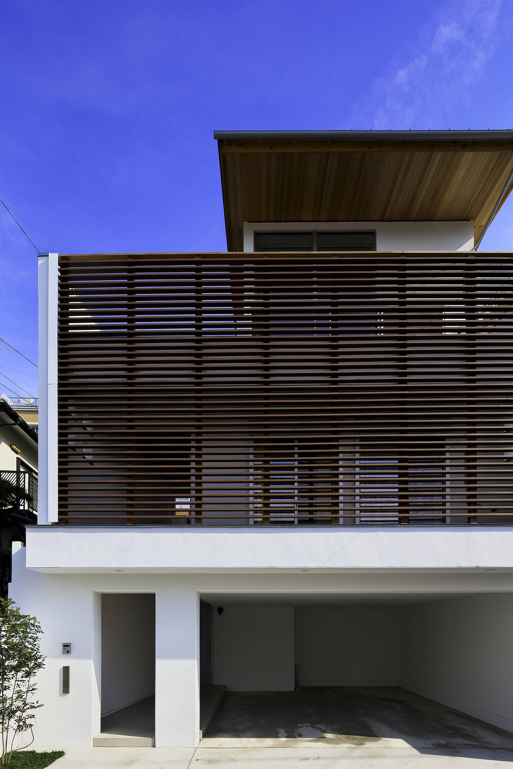 鎌倉七里ガ浜の変形+傾斜敷地に建つ木造2階建住宅。敷地の高...