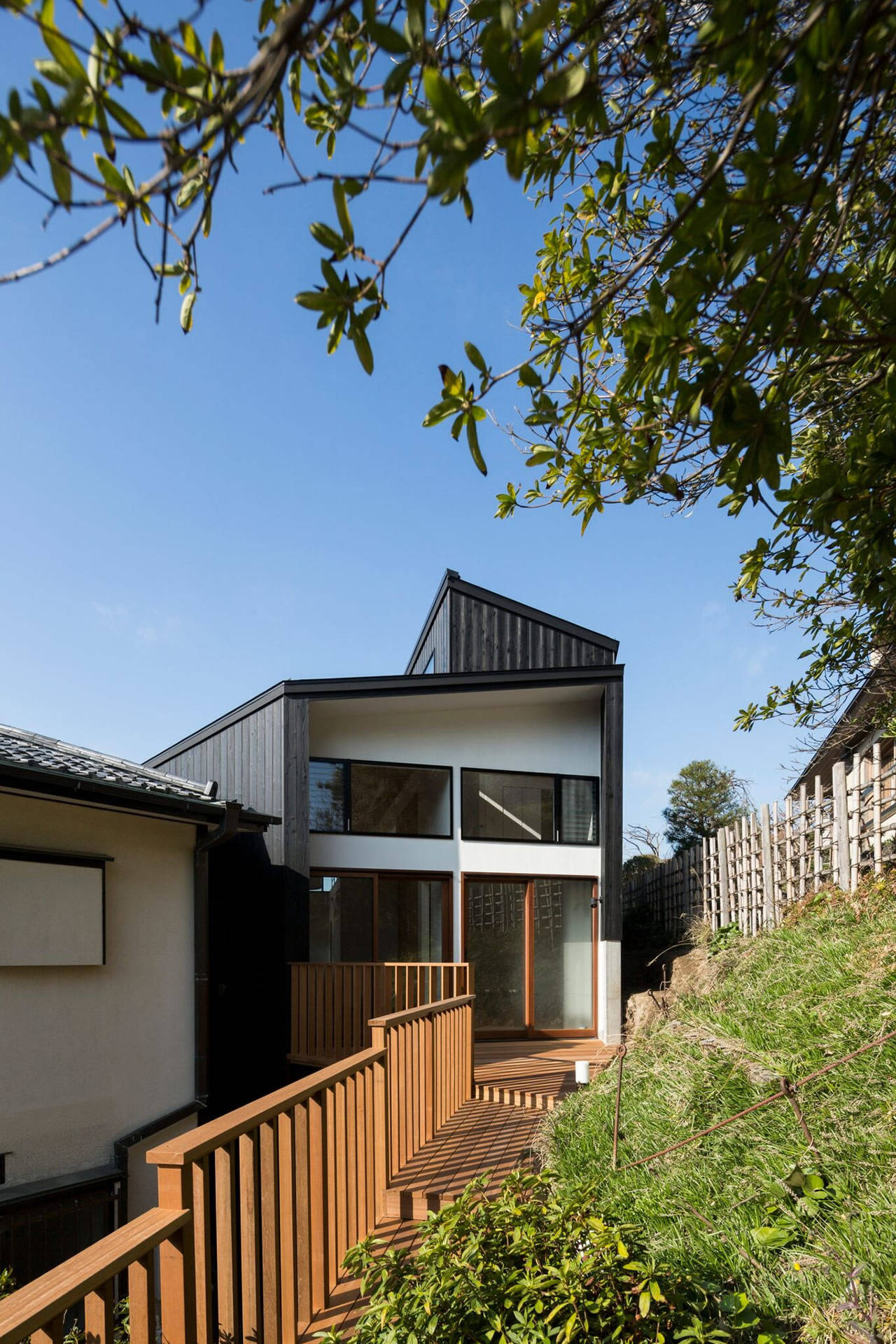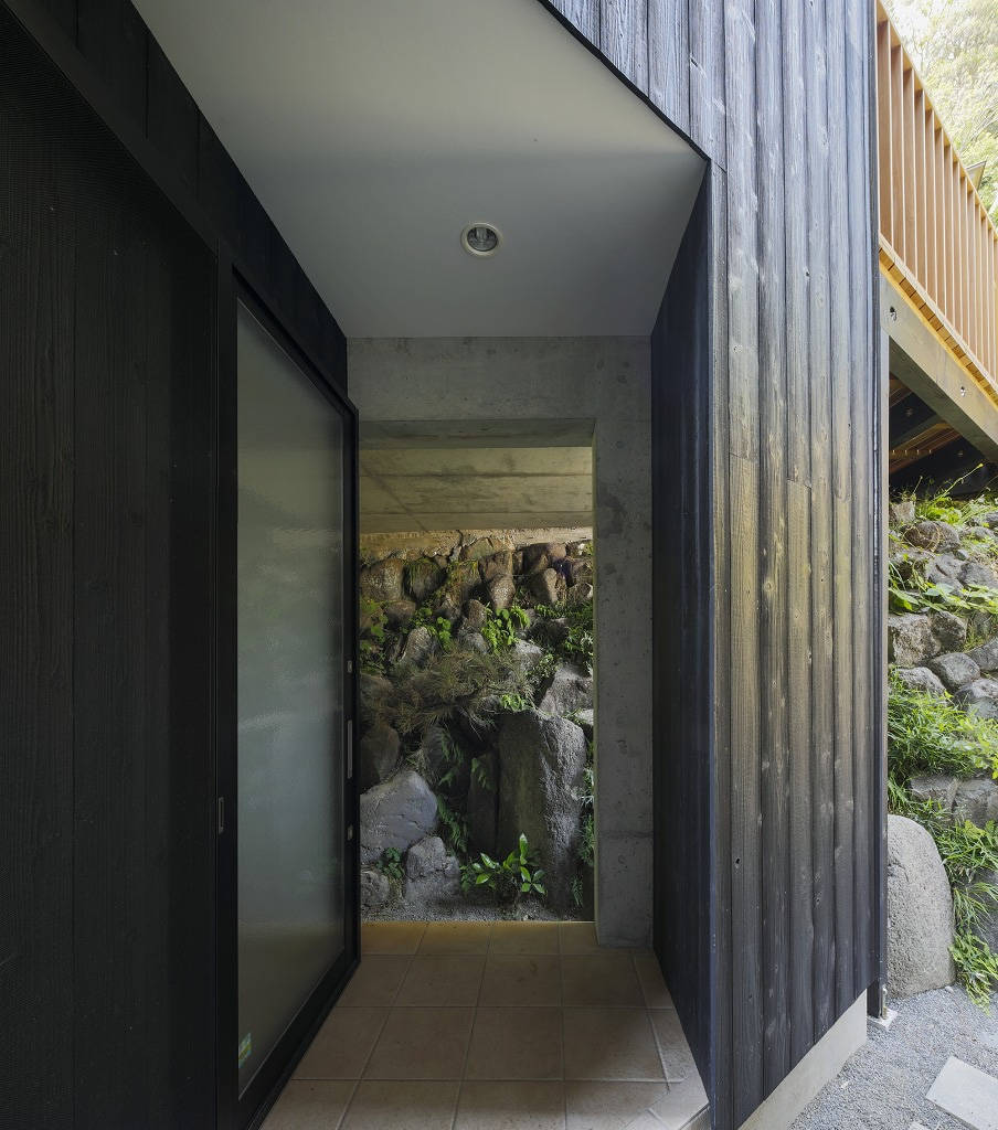 少ない平坦地から傾斜地にRC造の橋を架ける形とすることで、造成なしで既存傾斜地の補強と風情を残すことに成功しています。