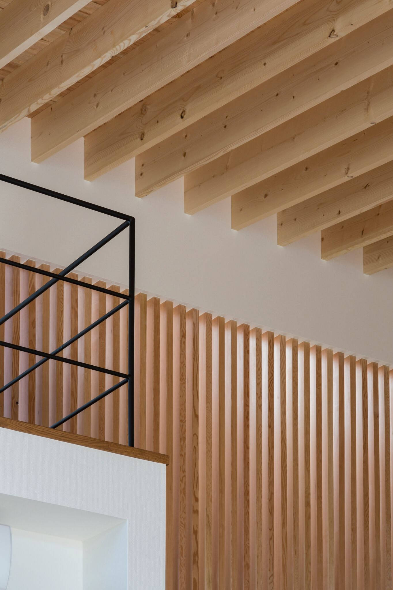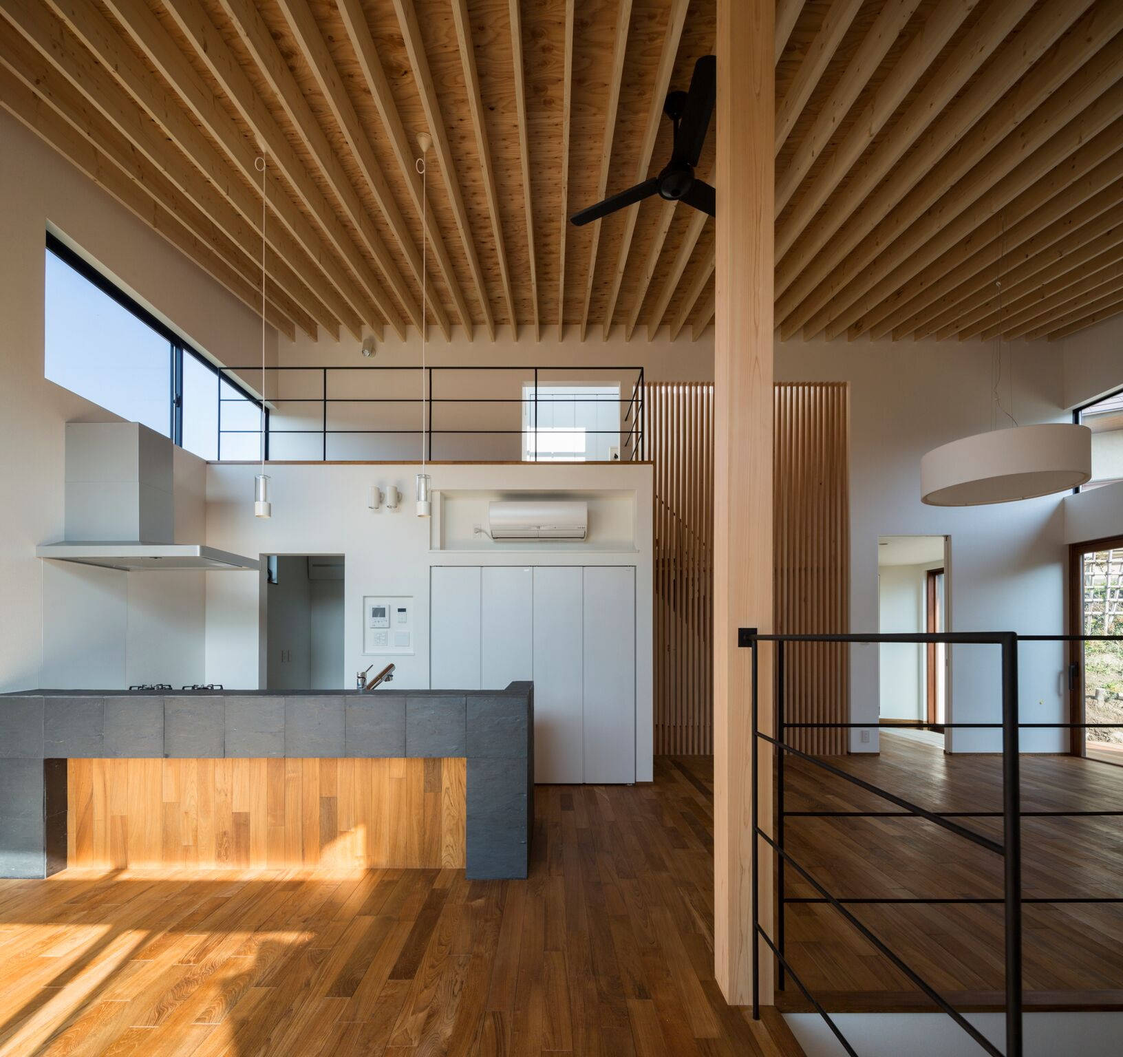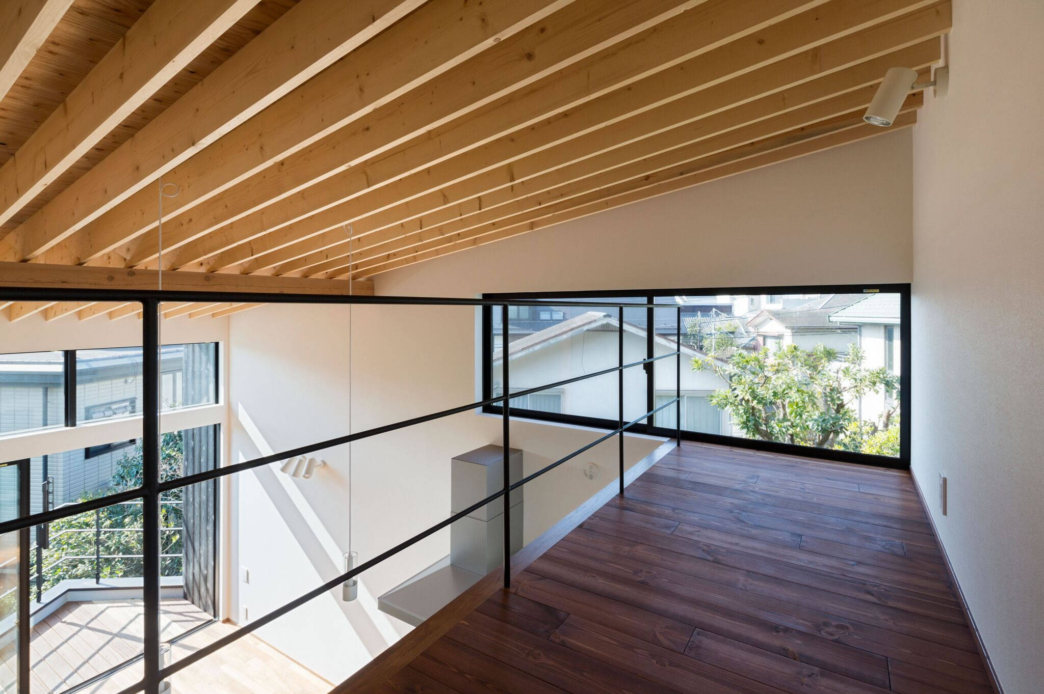 外壁焼杉板貼は既存樹木とのコントラストが美しく、既存樹木の間を通り抜けるアプローチの木道と悪条件が豊かさをたたえた魅力に変換しています。内部は垂木を表し力学的秩序の美しい架構表現を中心に、縦格子、チークフローリング、スケルトン階段、シンプルなデザイン、心地良い木質感としています。